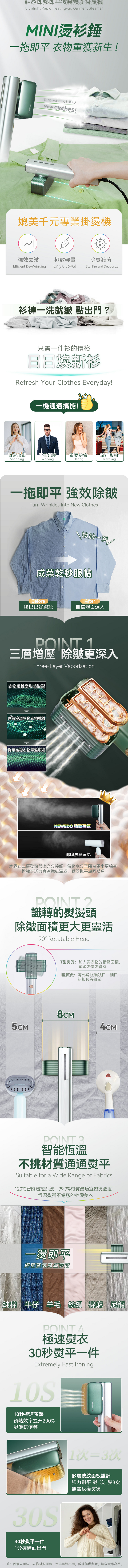 1.三重增壓發熱專利技術:氣化分子更綿密快速除皺,節水續航時間更長,熨衣不濕衣即燙即穿。