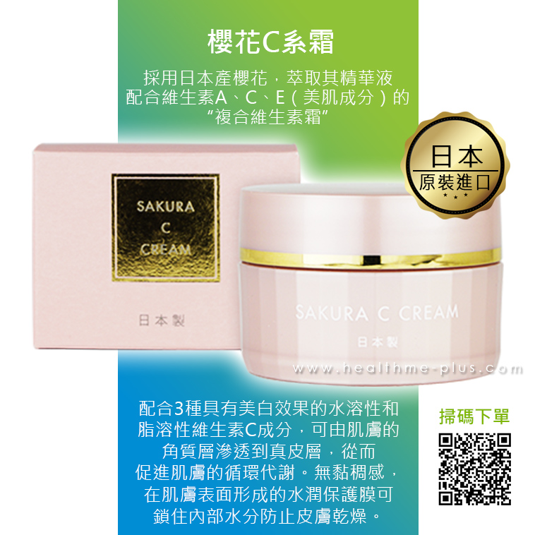 櫻花萃取物和三種維他命(維他命A, 油溶性、水溶性維他命 C 和維他命 E)的奢華混合物, 讓肌膚潔淨透亮。(又稱為“複合維他命面霜”,能夠滲透到真皮層,促進肌膚循環代謝。)