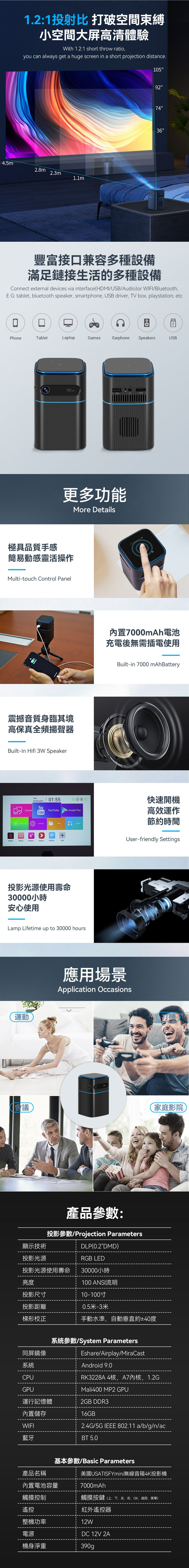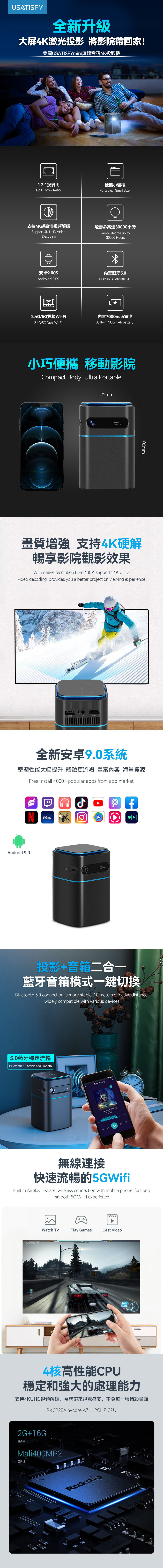 美国USATISFY|mini無線音箱4K投影機【正品】DLP成像,亮度達到100ANSI流明,畫面清晰細膩,支持4K和3D視頻播放【原裝行貨1年原廠保養】