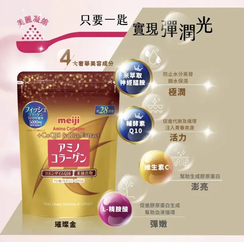 明治「膠原蛋白粉PREMIUM」除了多添加了美容配方輔酵素Q10、玻尿酸、還有神經醯胺外,膠原蛋白粉使用來自於魚的低分子化膠原蛋白,這種膠原蛋白比起一般使用豬皮製成的膠原蛋白更好吸收,吸收力多1.5倍喔!