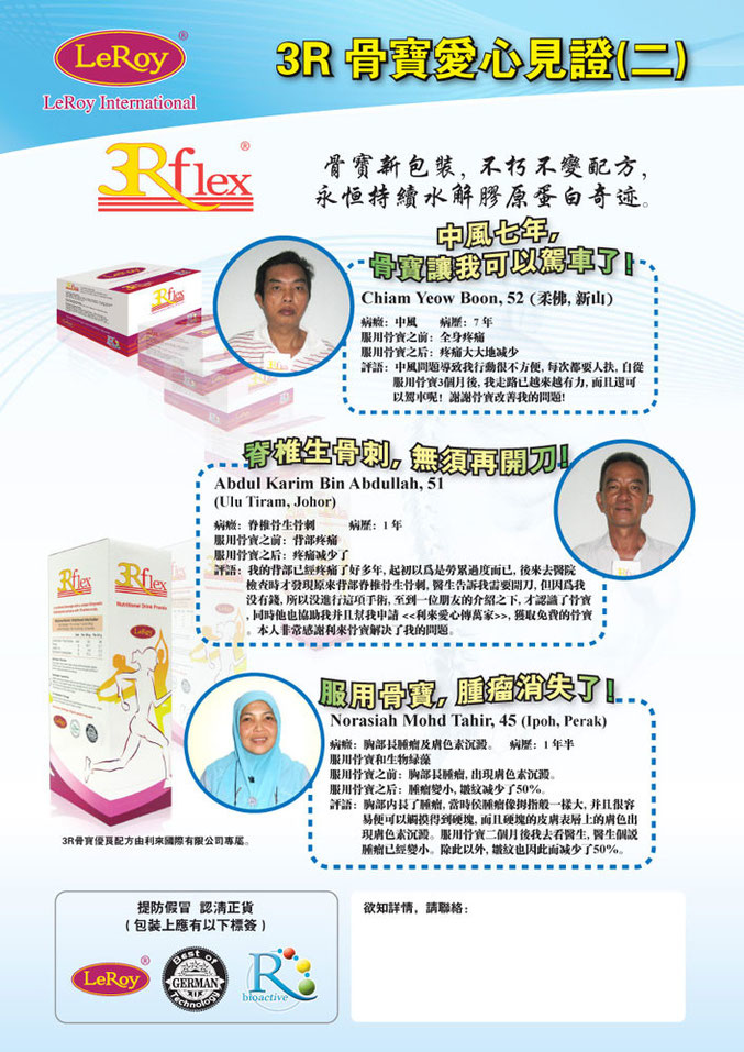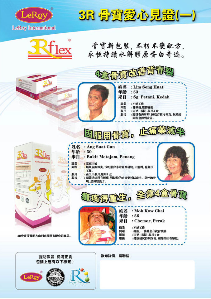 『水解膠原蛋白』是針對人體的優良吸收而設計的,因為這才能產生最大的益處。因此,3Rflex骨寶是一種輔助食物,非常容易飲用、安全、方便和有效。