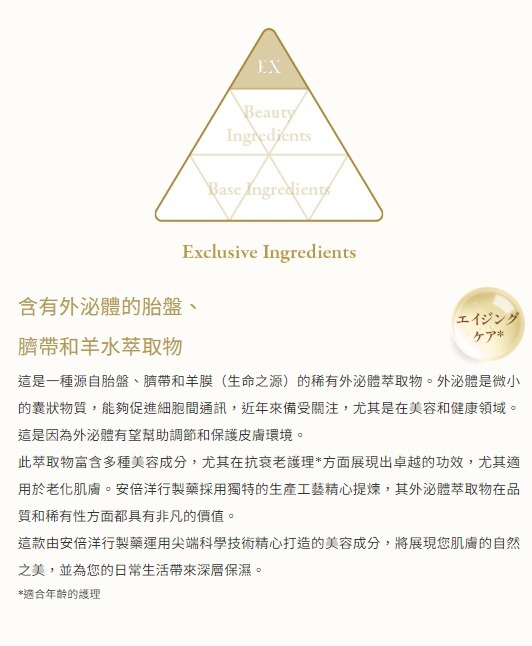 尤其適用於老化肌膚。安倍洋行製藥採用獨特的生產工藝精心提煉,其外泌體萃取物在品質和稀有性方面都具有非凡的價值。