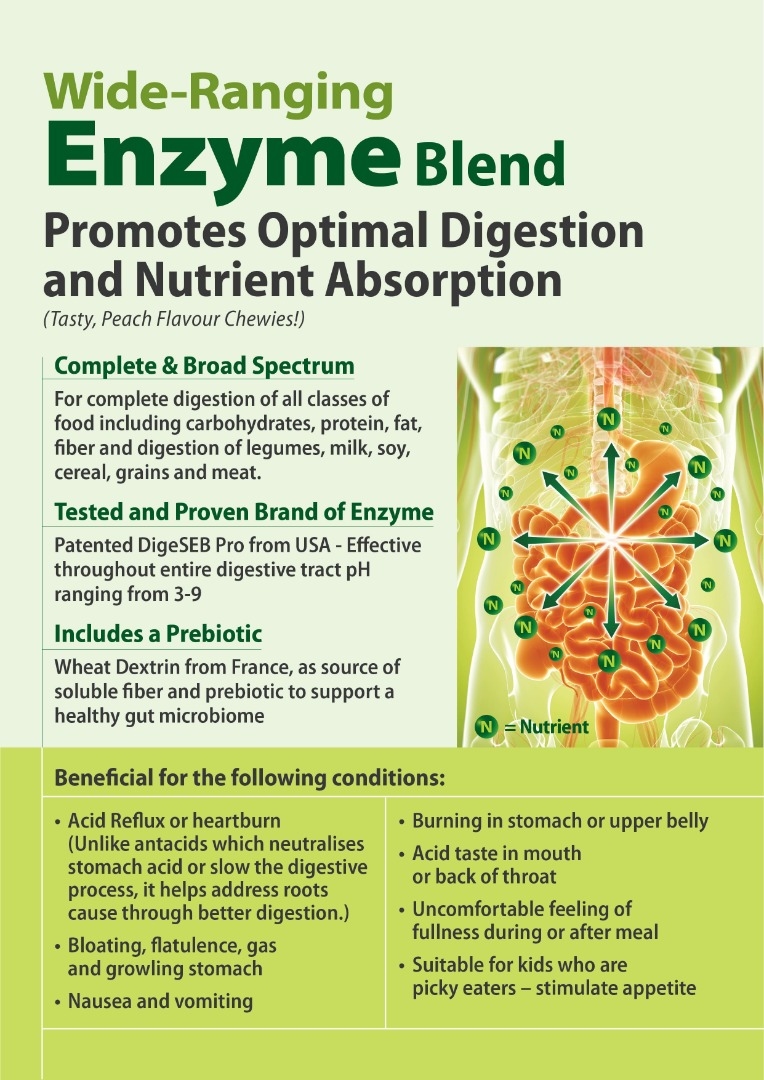 美味可口的桃子味口嚼錠含有多元化酵素組合,可促進最佳的消化和營養吸收。