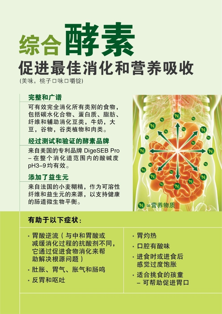 每錠結合了來自美國的專利成份DigeSEB® Pro 、來自法國的小麥糊精以及綜合蔬果汁。它有利於: