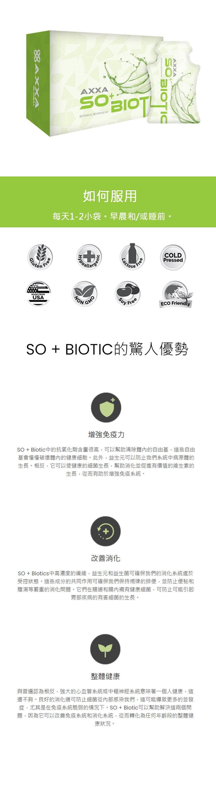 AXXA Global通過我們專有的NatureFRESH Cold-Press™有機黑小茴香種籽油,Balanlac®(副乾酪乳桿菌)和兩種益生元,Fibersol-2™和低聚果糖,創造了一種植物性飲品混合物AXXA SO + Biotic,是支持該產品的主要成分。免疫系統和胃腸健康隨著年齡的增長或身體發育而逐漸下降。 AXXA Global創造了一種行
