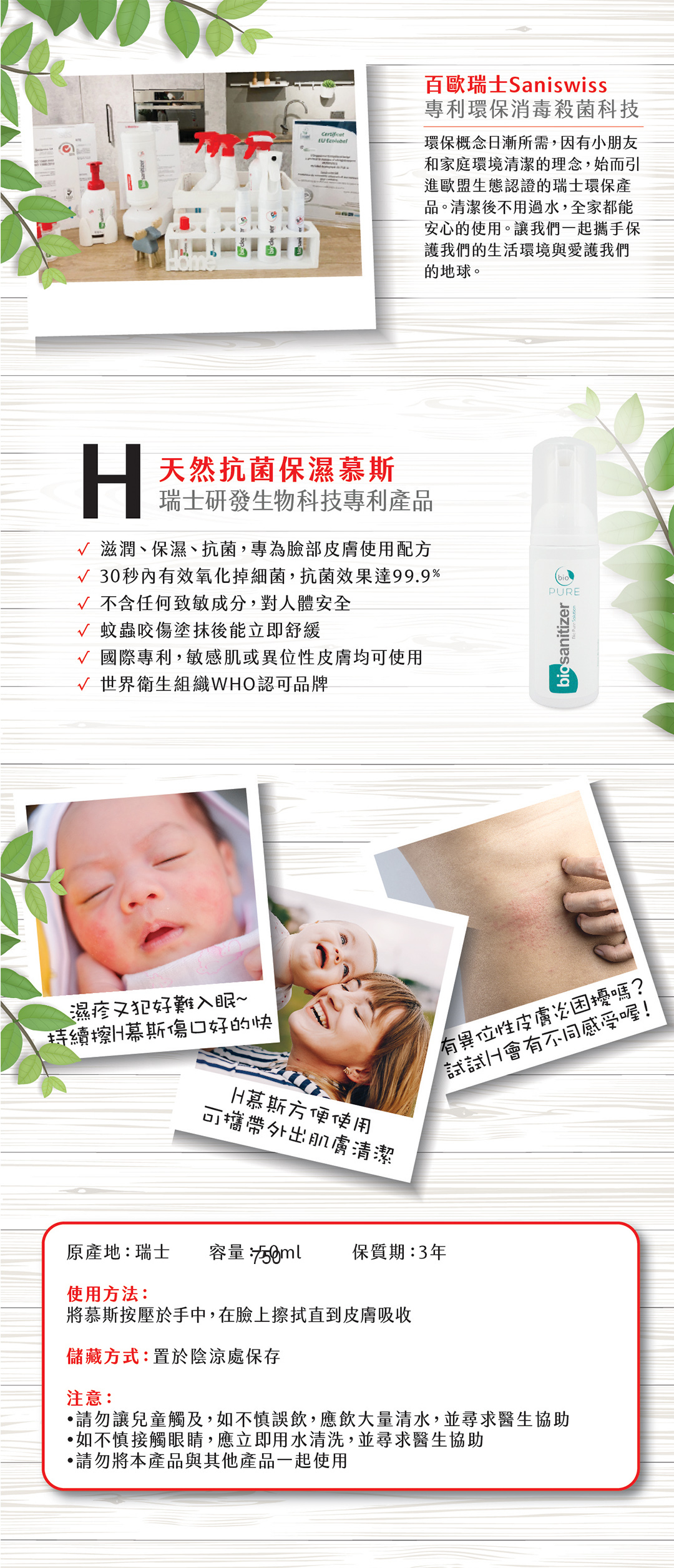 瑞士Saniswiss天然抗菌保濕慕斯也適用於臉、全身並同時結合了保濕、改善膚質、止癢‚有效除菌等多功效於一身。