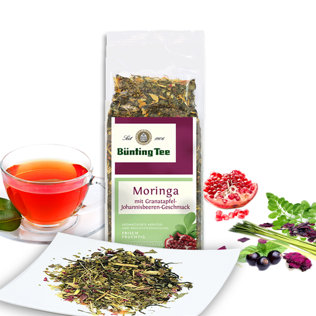 以蕁麻葉,檸檬香脂葉,蘋果片,香茅,香氣,辣木葉,黑加侖子,石榴籽,玫瑰花瓣,萬壽菊配製而成,混合了誘人甜蜜的水果味道,冷飲/熱飲皆宜,讓你充滿活力.辣木茶富含微量元素,有助於睡眠、提神醒腦、增強消化、頤養脾胃、消除疲勞、抗憂鬱等功效