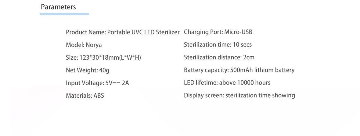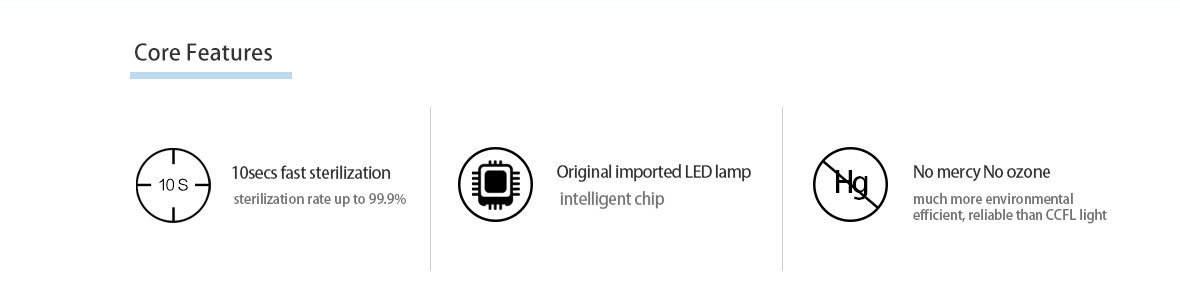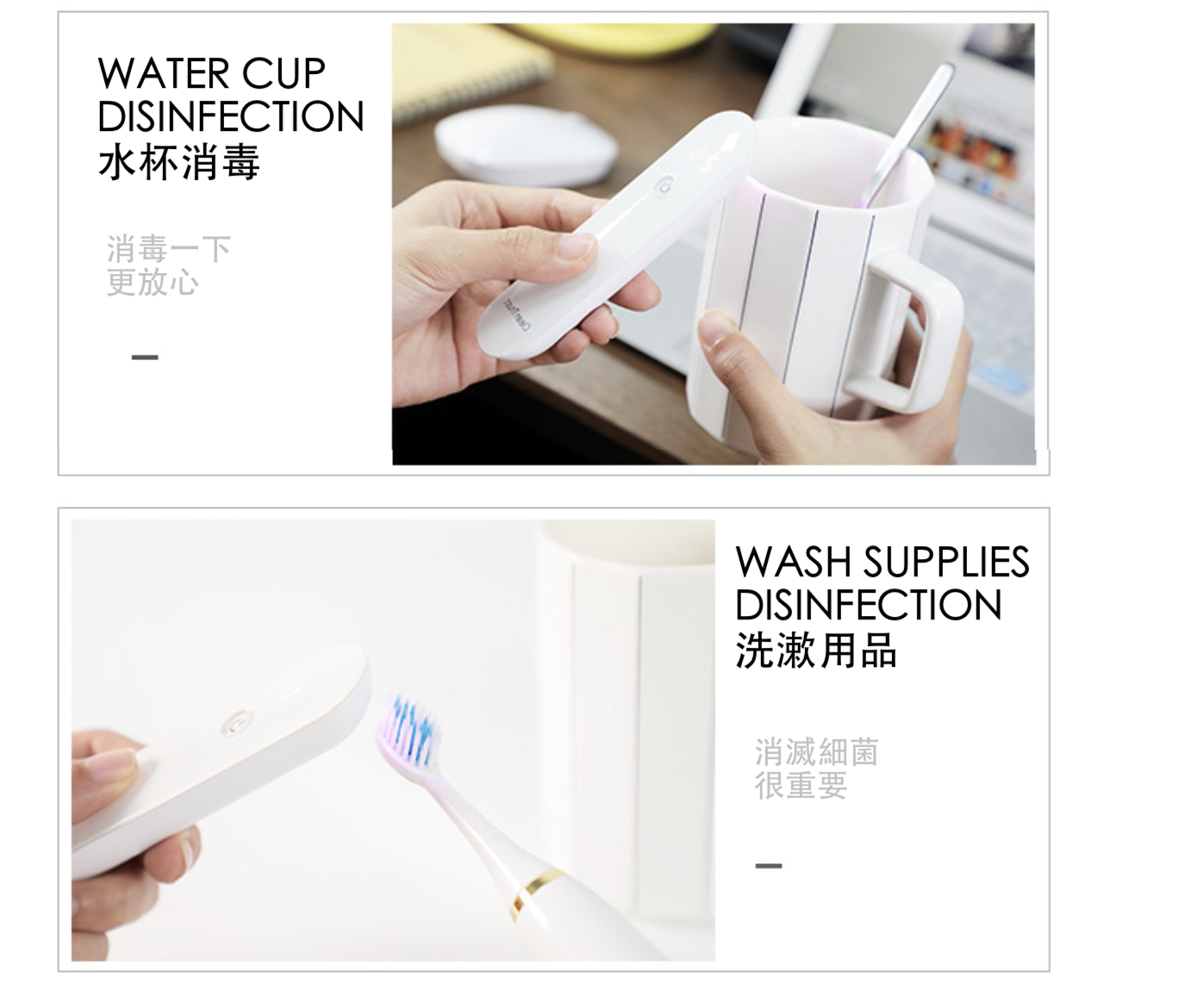 使用原裝進口的IC智能控制芯片及深層紫外LED燈珠,只要對準需要消毒的物品照射,即可在10秒內快速殺菌,殺菌率高達99.99%,迷你手提式,方便攜帶