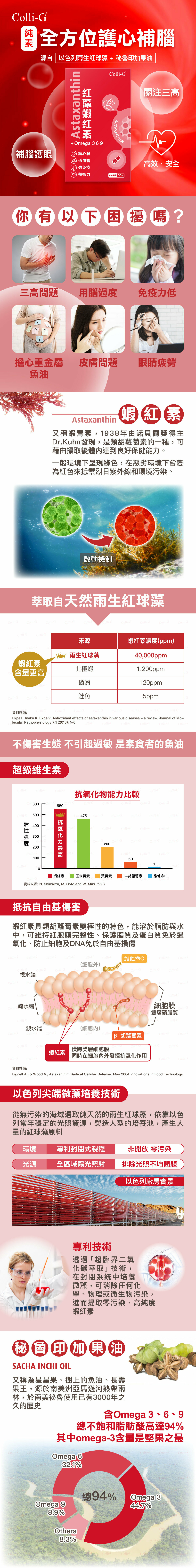Colli-G 紅藻蝦紅素萃取自純天然雨生紅球藻,是素食界的高抗氧成分,有效清除細胞內的自由基,增強細胞再生能力,優化代謝力,延緩衰老。配合健康果王印加果油,含豐富黃金比例Omega 3、6、9,有助維持心血管健康,活化腦細胞,增強記憶,可改善視力、皮膚、免疫力,肌肉力量。雙重成分,功效加倍,純素配方,適合素食者服用。