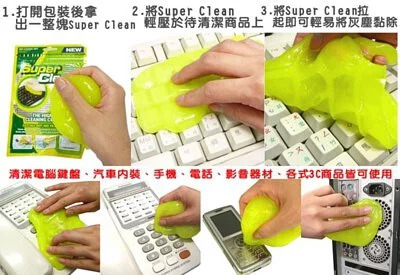 • 魔力去塵膠(Super Clean),又名:電腦清潔膠,汽車清潔膠,鍵盤清潔泥,清潔膠,是一款專業吸附灰塵(尤其犄角旮旯難清潔角落),能有效直接吸住縫隙中的灰塵、毛屑,不四處飛揚。