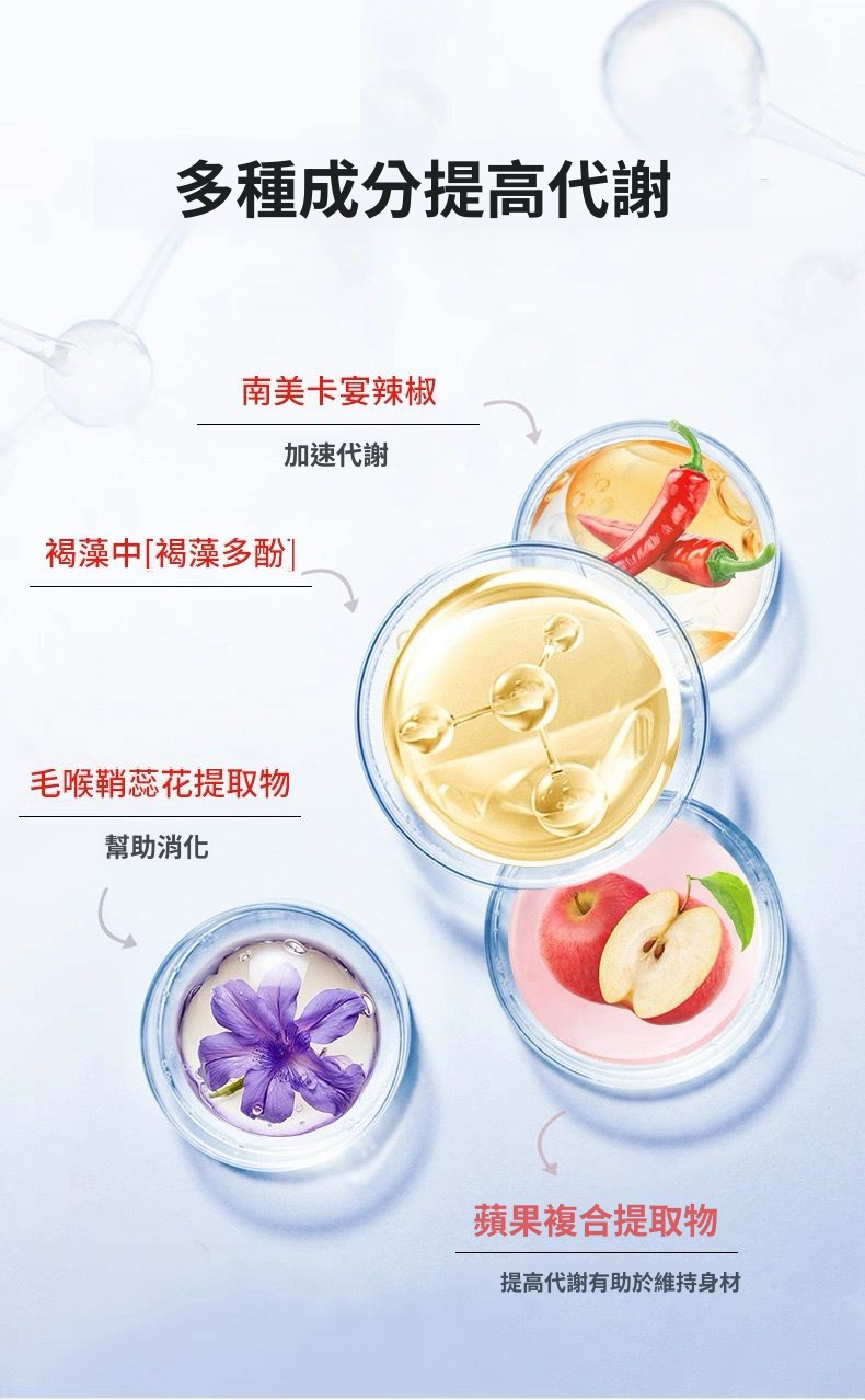 -辣椒。其配方還含有基於果膠、粉末和蘋果萃取物的複合物,是一種天然的食慾抑制劑。