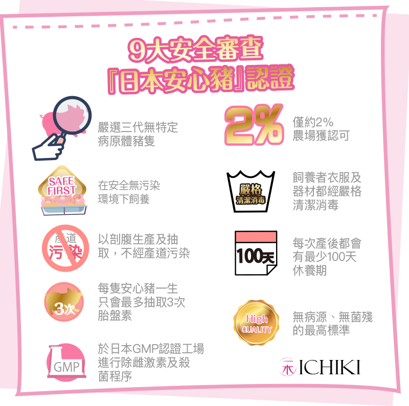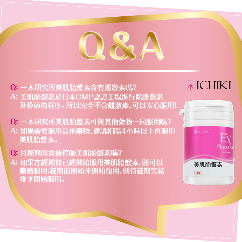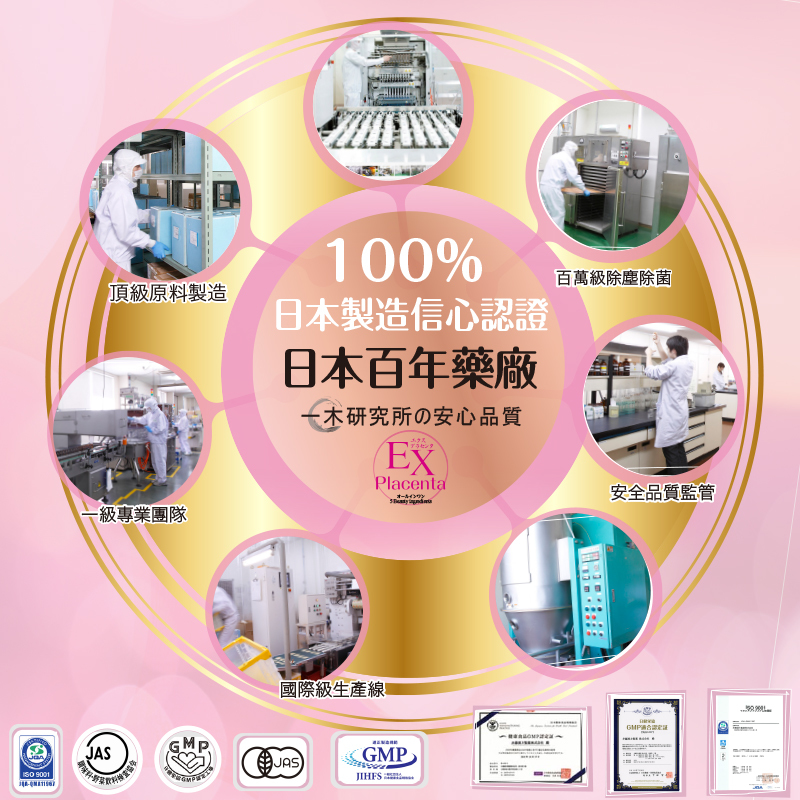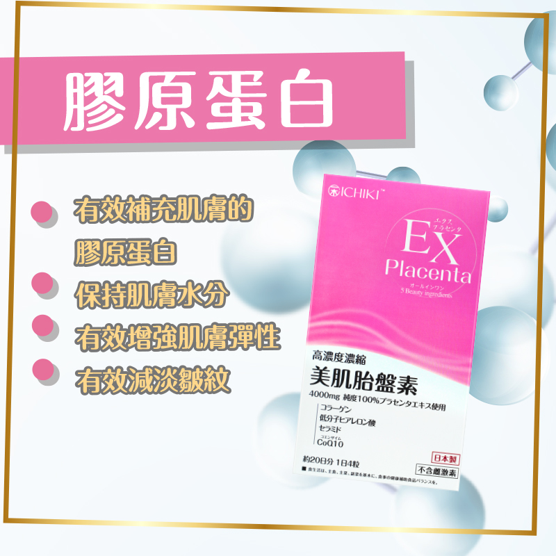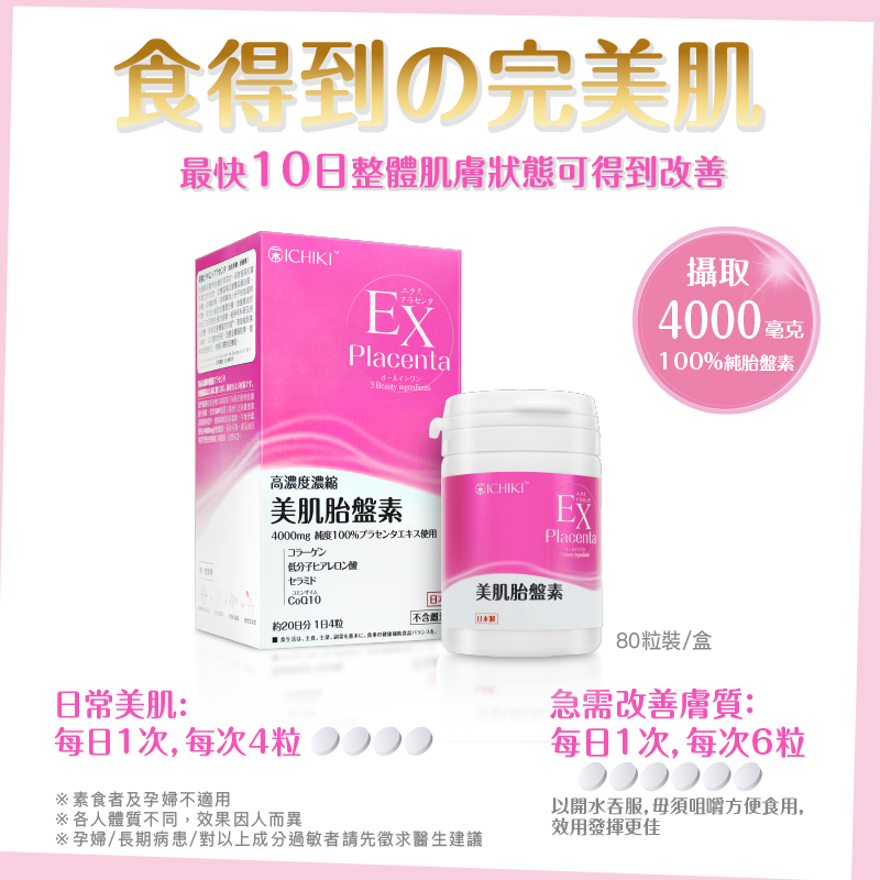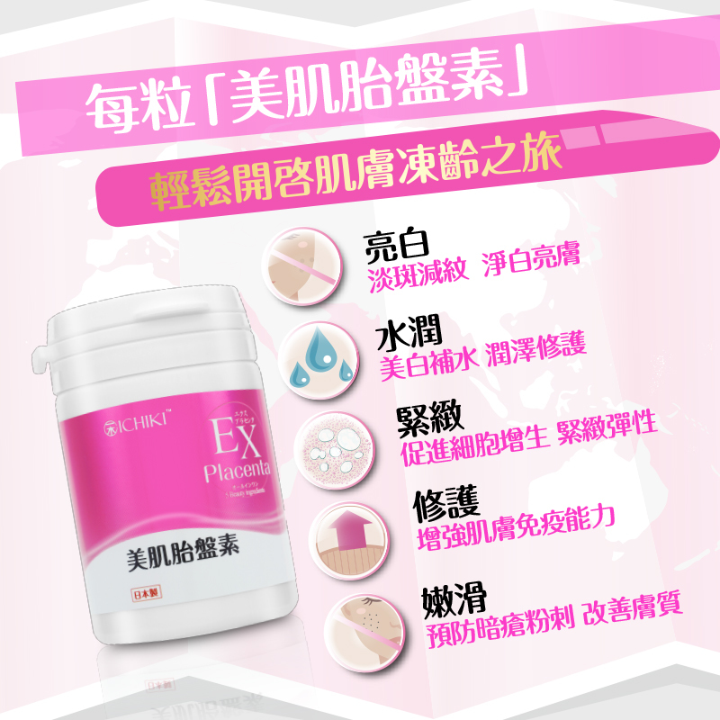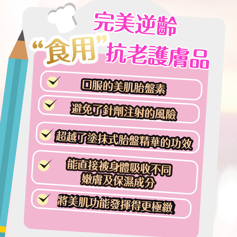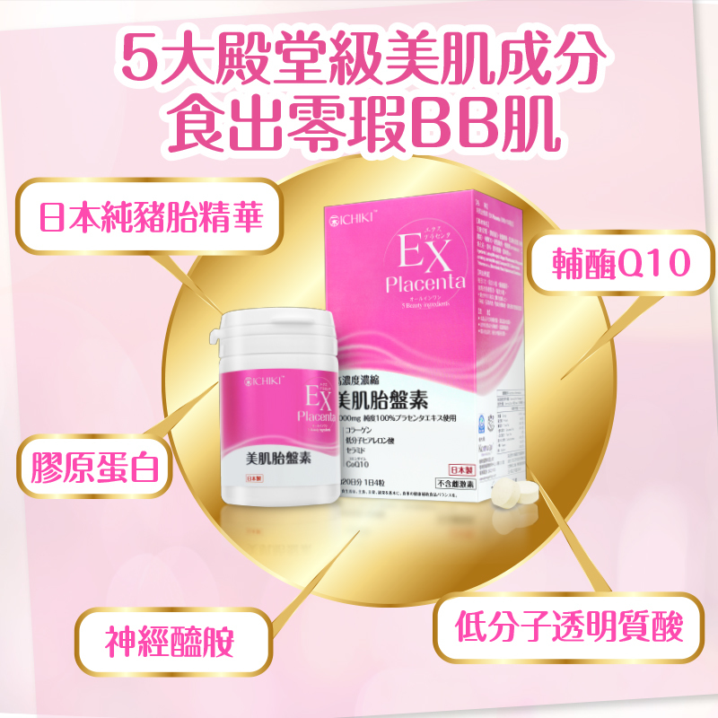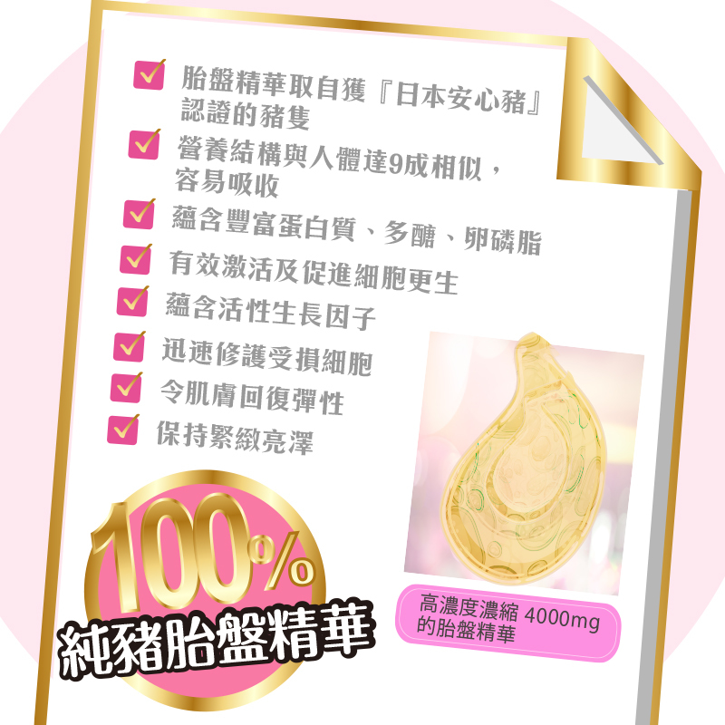 蘊含100%純日本豬胎盤精華、膠原蛋白、神經醯胺、輔酶Q10、低分子透明質酸,5大殿堂級美肌成分,研製成高效的美肌食用護膚品。每分美肌胎盤素均蘊含高濃度濃縮4000mg的胎盤精華,有效刺激細胞更生,顯著改善肌膚質素,達致逆齡美肌的效果,整體肌膚可於最快10日內可得到改善。