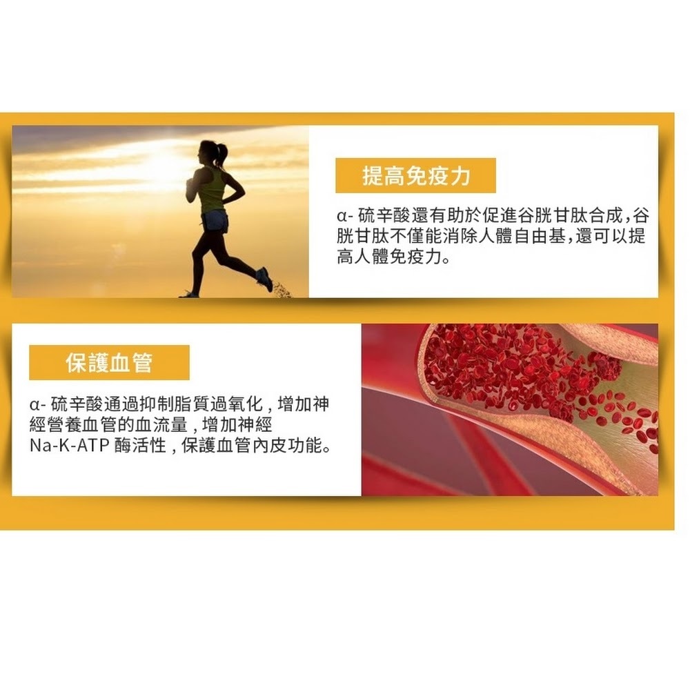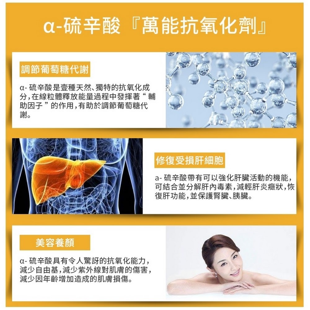 α-硫辛酸是一種存於線粒體的輔酶類似維生素,被稱為萬能抗氧化劑;它的主要作用是防止糖分跟蛋白結合,讓血糖變得安定,減少對胰島素的依賴;同時能去除加速老化的自由基。