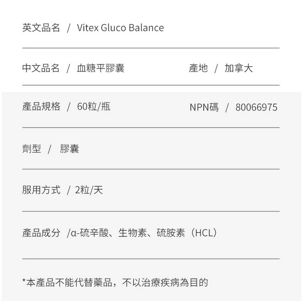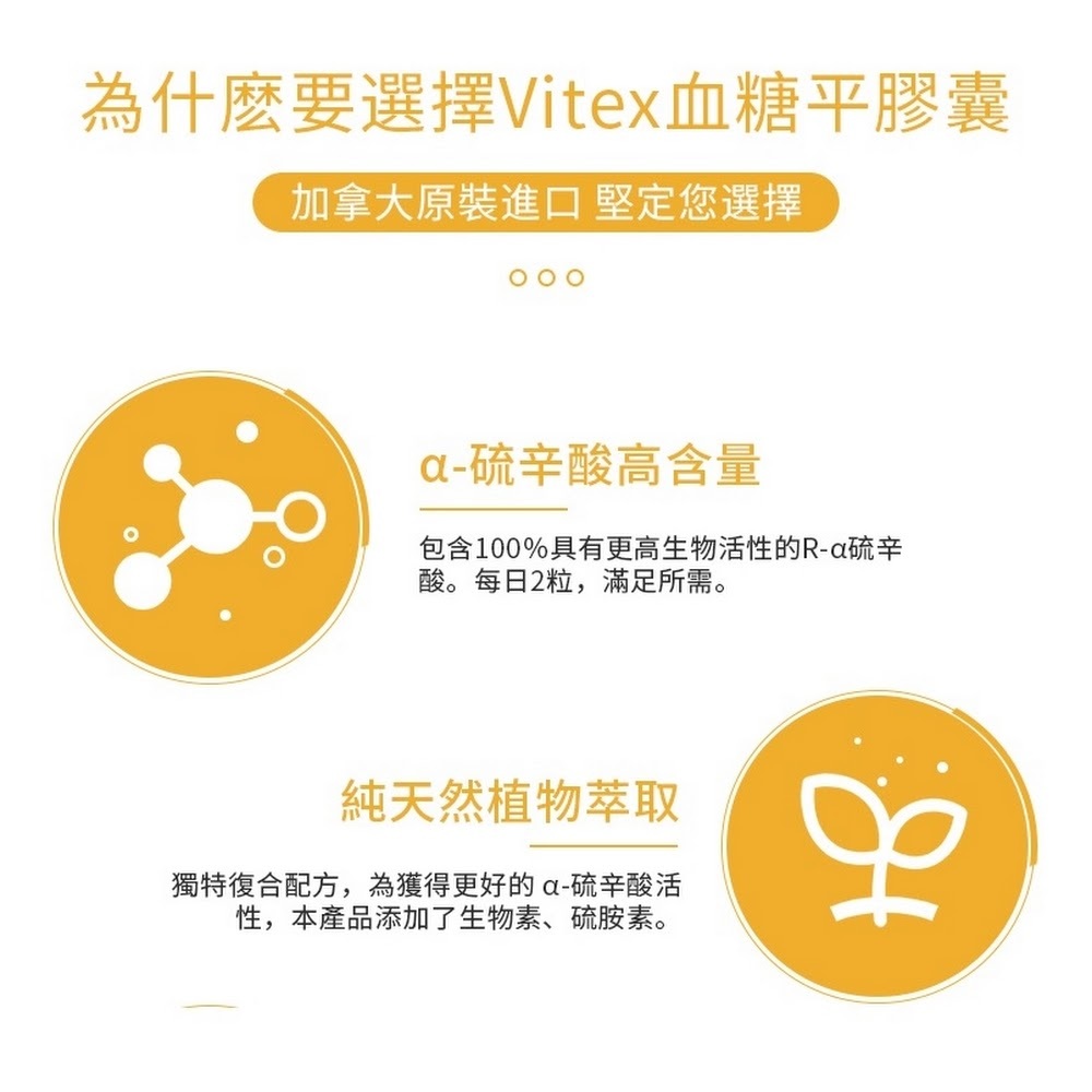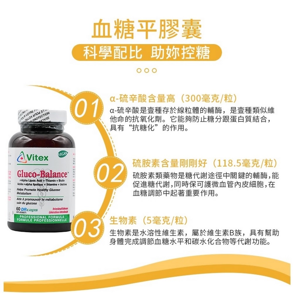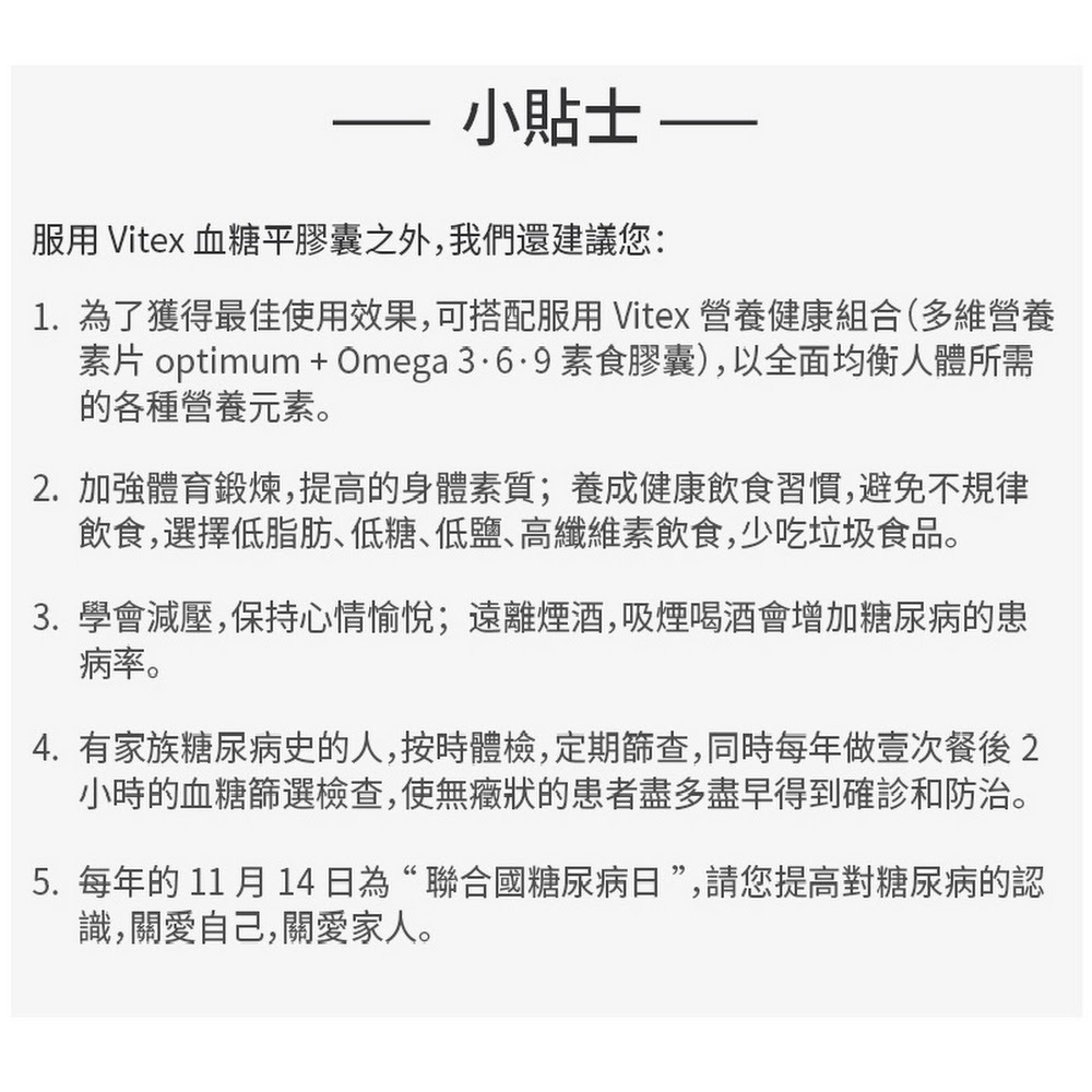Vitex 血糖平含100%高生物活性α-硫辛酸(α-硫辛酸600毫克/日),幫助2型糖尿者平衡血糖。