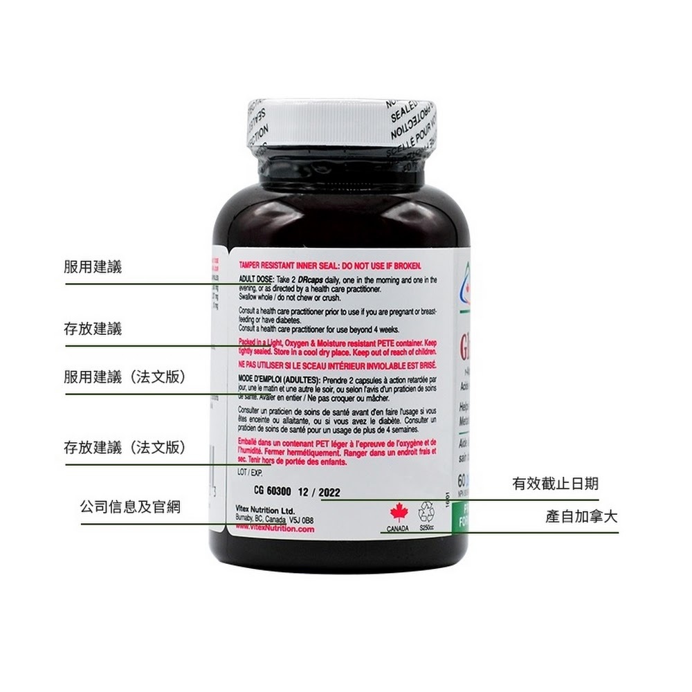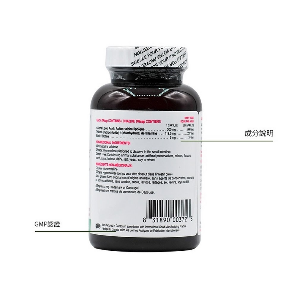 成份: r-Alpha Lipoic Acid/ Acide r-aplha lipoique 300mg/Capsule, Daily Dose 600mg/2 Capsules