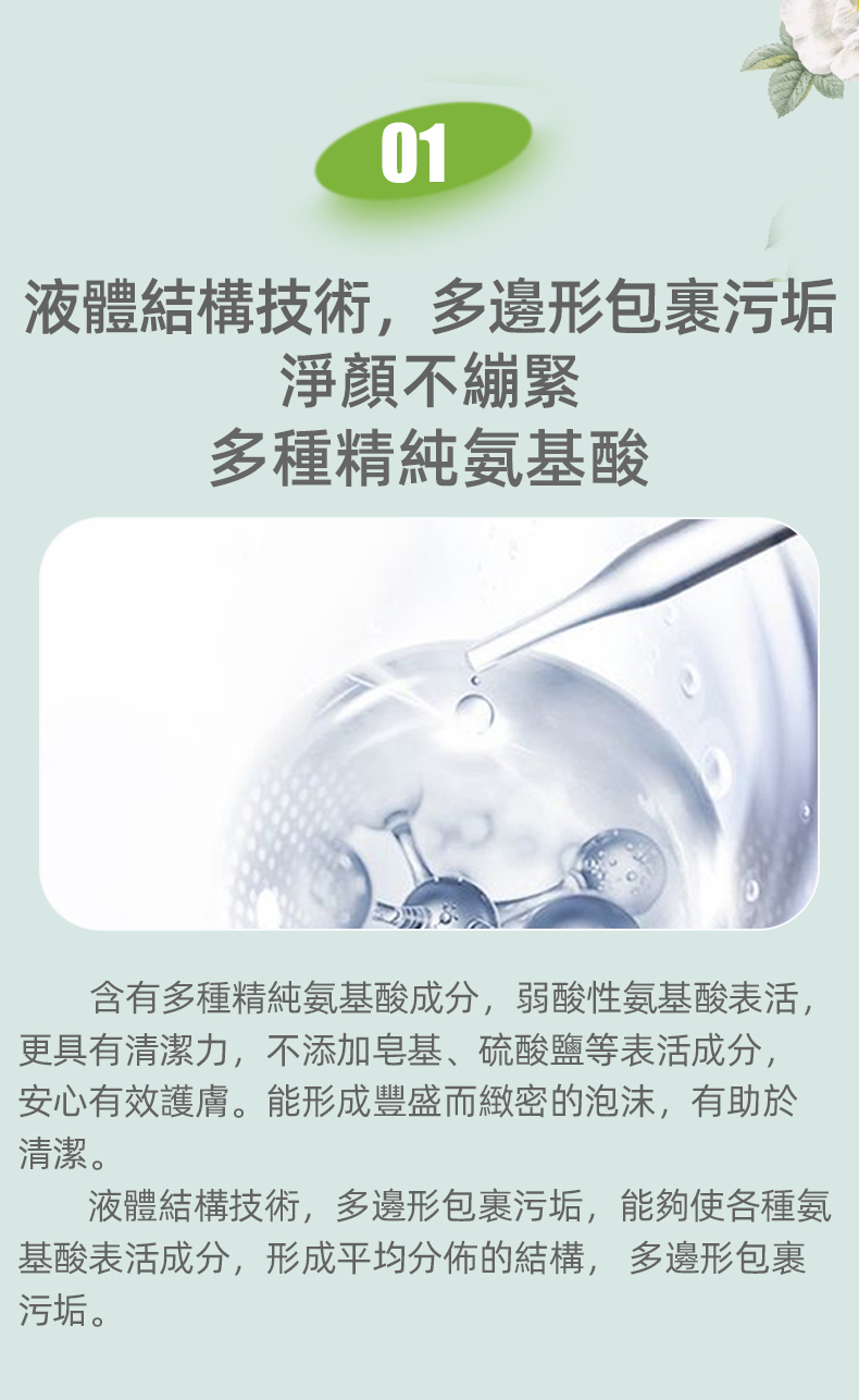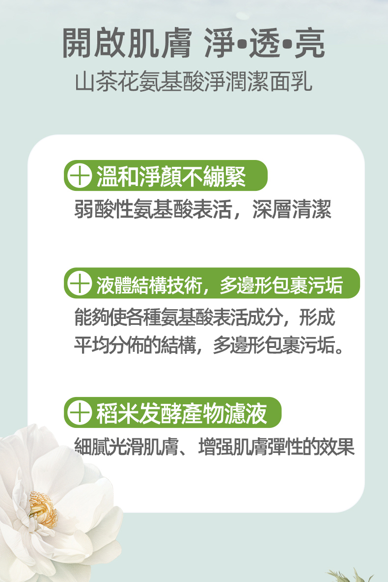 鎖水潤養#不繃緊#控油清爽#敏感肌適用#不添加皂基,硫酸鹽等表活成分#豐盛泡沫#改善泛紅#保水鎖水#水油平衡#調節皮膚#促進肌膚新陳代謝#增加柔潤#防止角質化#抑制酪氨酸酶活性化#增白#細膩光滑#增強彈性#潤養肌底。