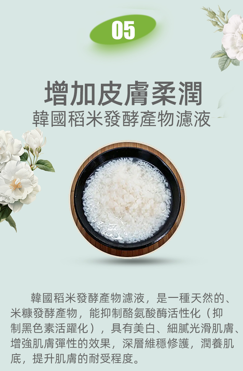 具有美白 細膩光滑肌膚 促進肌膚身陳代謝 促進水油平衡 增強肌膚彈性效果 深層維穩修護 潤養肌底 提升肌膚的耐受程度 減少油光 增加皮膚的柔潤 防止皮膚角質化而減少皺紋