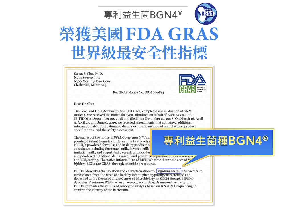 ▲專利BGN4益生菌,榮獲美國FDA GRAS世界級安全性指標