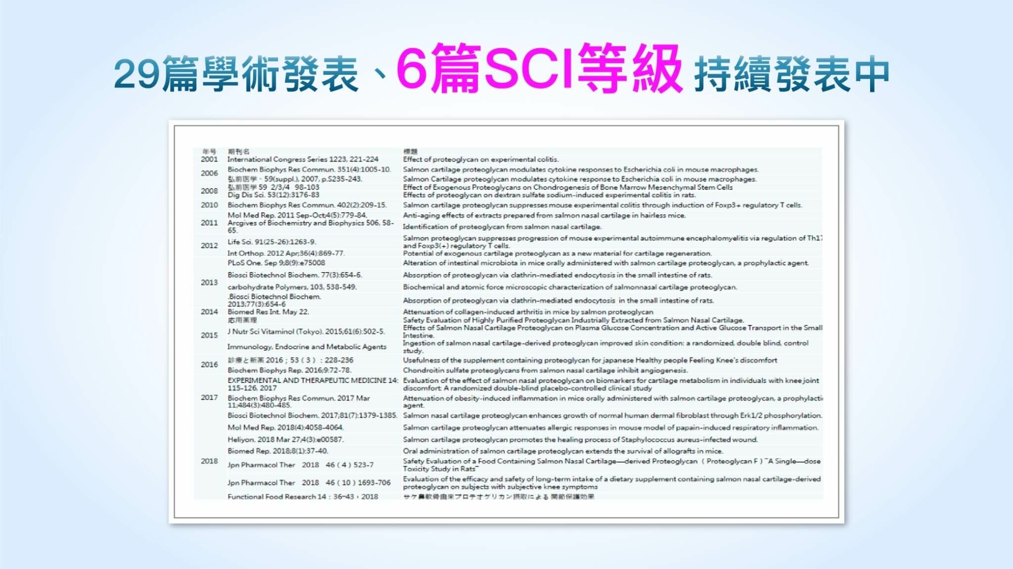 蛋白聚醣是以核心蛋白與多個糖胺聚醣(如硫酸軟骨素)結合而成一種醣蛋白,在身體關鍵結構中皆擔任重要的角色。婕樂纖專業醫學顧問團隊特別選用日本一丸頂級專利蛋白聚醣,具有29篇科學文獻佐證,每1kg珍貴原料需要來自1600尾鮭魚所製成,榮獲日本農林水産大臣獎及文部科學大臣獎。
