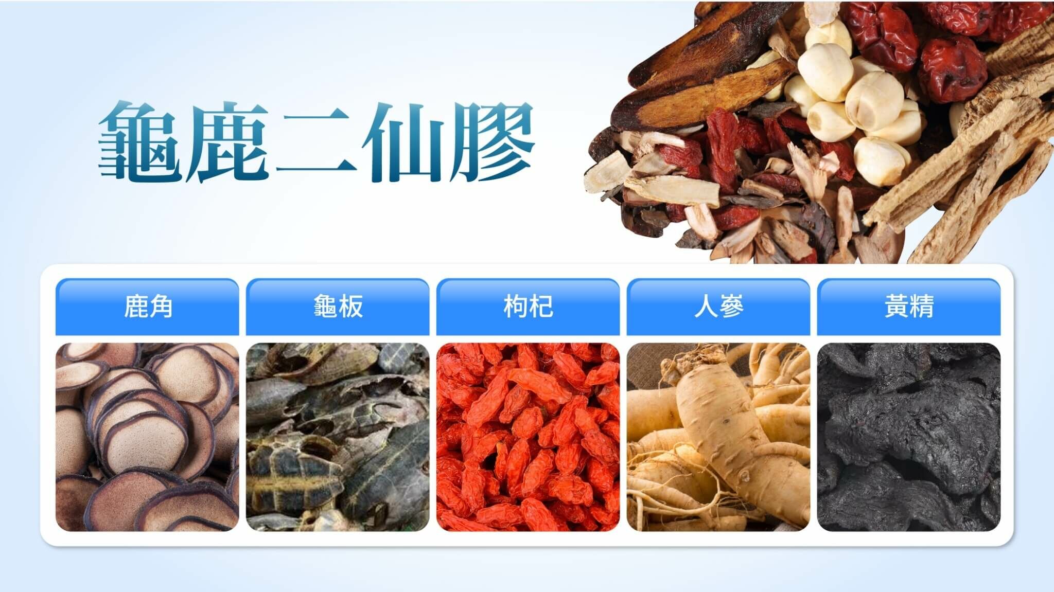 正統的龜鹿二仙膠,需經過政府核可的天然成分,皆有規範一定的比例及成分,透過長時間熬煮,鹿角、龜板溶出豐富的「膠質」與「天然鈣質」,能夠滋補養身,使精神旺盛。