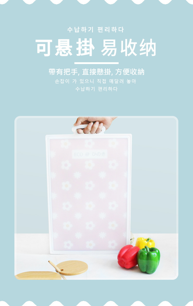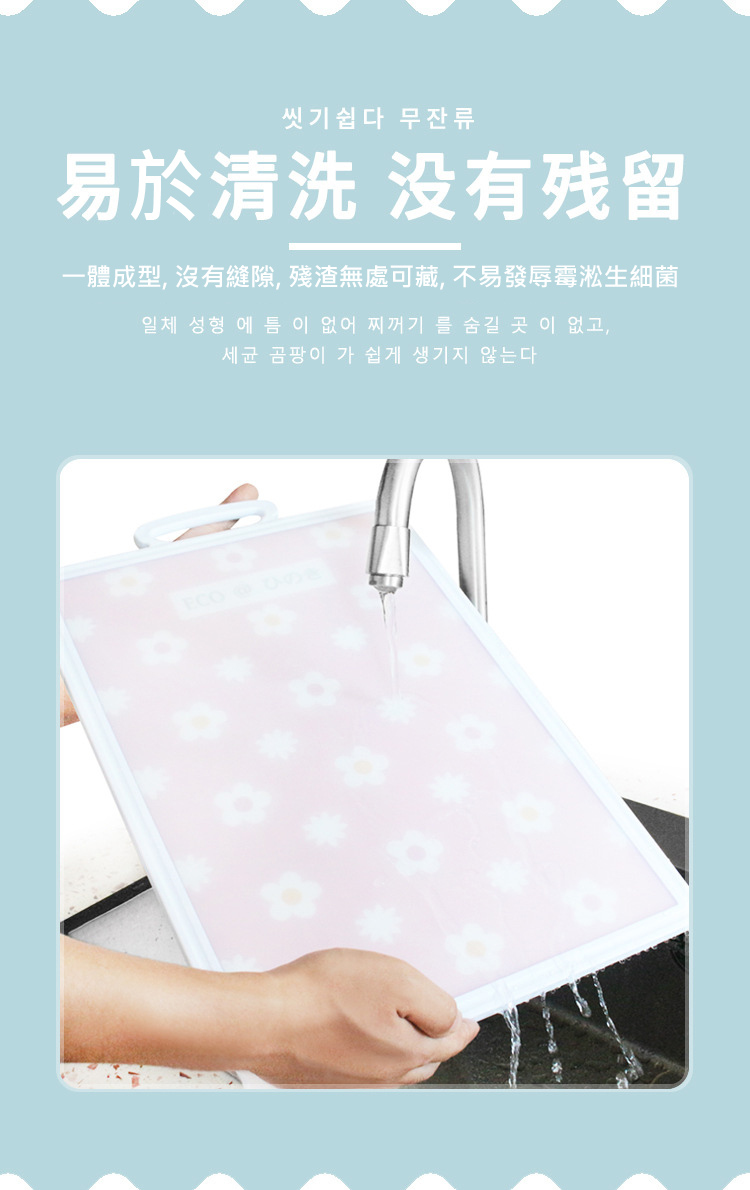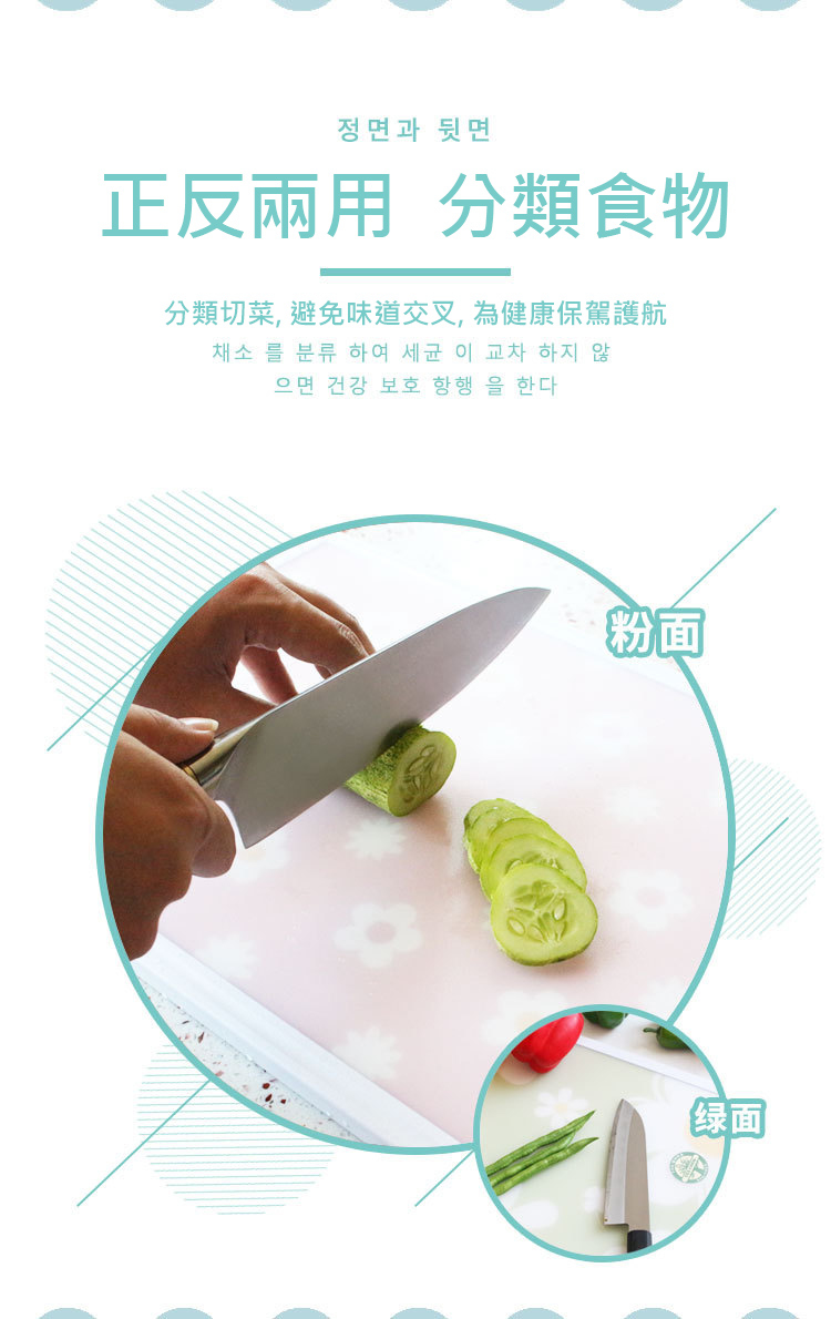 韓國熱銷雙面抗菌砧板,嚴選PE、MDF材質,砧板表面無毛孔密度高,不吸水、不發霉、不染色,不藏汙納垢,周圍環繞防漏止滑溝槽,防止汁液四溢,雙面皆可使用,避免食材交叉感染,不竄味更衛生乾淨;收納掛勾孔,好拿好放更方便使用,韓國原裝進口,緻密優良質感廚具。