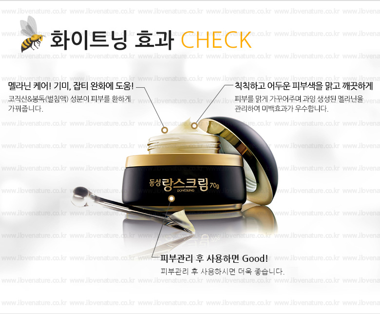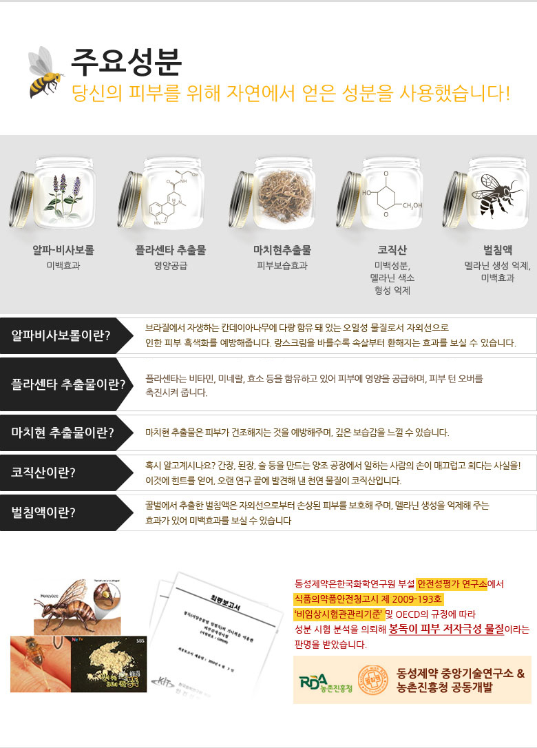 蜂毒就是蜜蜂尾部毒腺分泌的液體,東星這個蜂刺液的專利成分(專利號10-1225114)讓暗淡的肌膚變得白晳透亮