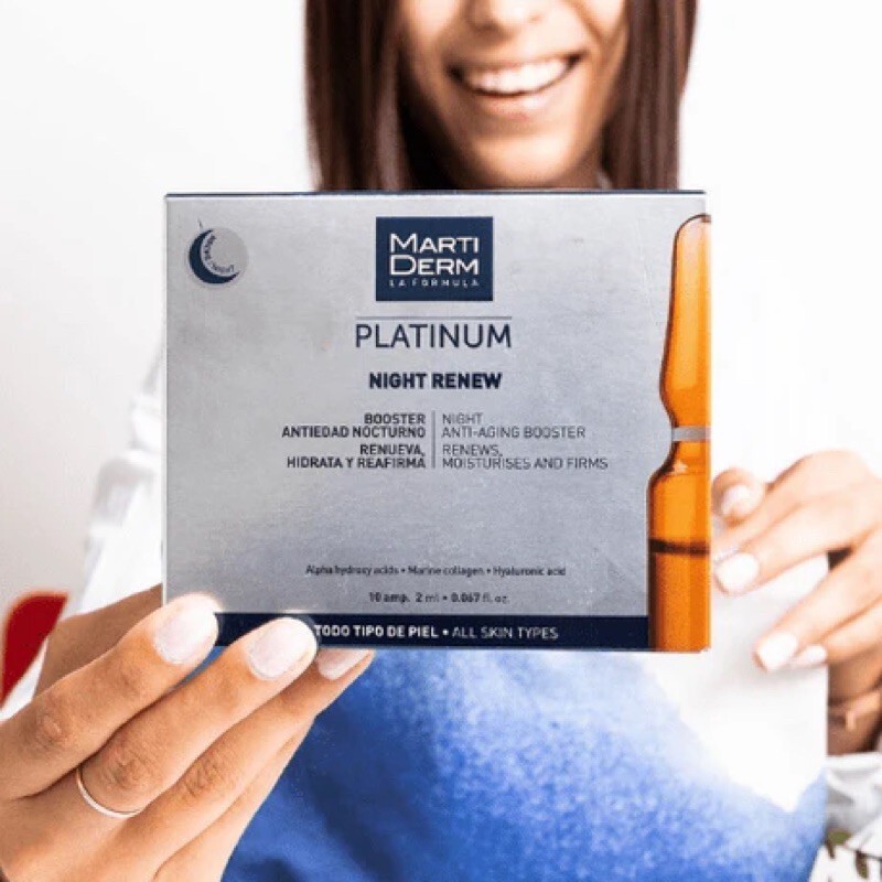 Martiderm 夜間煥膚鉑金安瓶柔膚煥顏精華是一款含有 10% AHA 的柔膚抗老護理產品,可更新肌膚紋理並改善所有老化跡象。