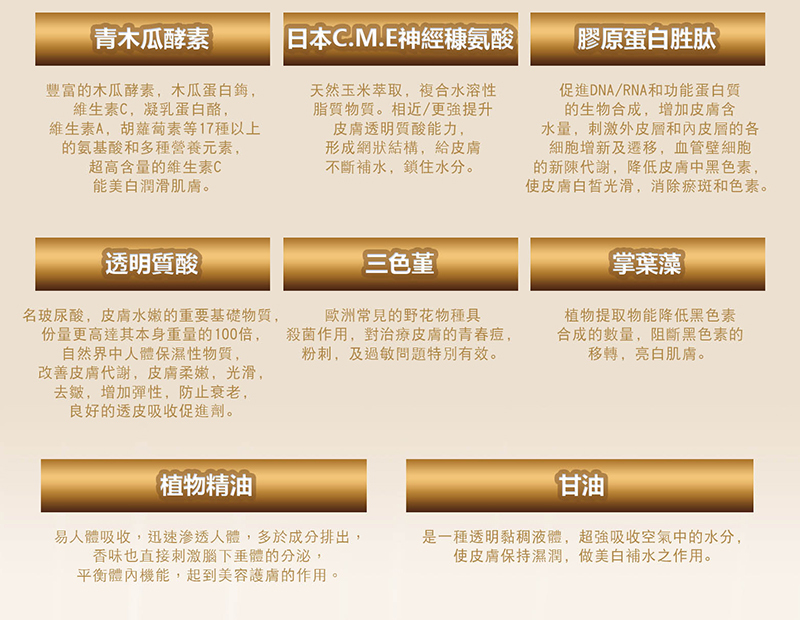 C.M.E青木瓜酵素面膜,配以專業的生物新技術極緻完美配方,使養分導入肌膚,同時賦予潔淨肌膚功效,預防外來刺激,以智慧科技啟動細胞,幫助深層肌膚再生,加上C.M.E神經醯胺酸及青木瓜酵素的互相輝映,使產品效能發揮到極緻。其天然成份無刺激性,堅持使用後肌膚即迅速回復嬰兒般細緻嫰滑,效果顯著,可謂含有<智慧>和<平衝>能力的面膜。