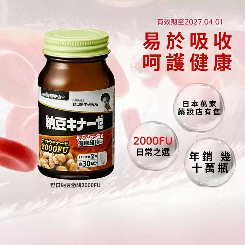 本品含2000FU納豆酶,FU是衡量納豆中含有的納豆酵素有效含量的國際標准單位。2000FU是指一日份量的膠囊中就有2000FU的納豆酵素。,日本營養健康食品協會規定納豆酶的日常正常維持量為2000-4000FU