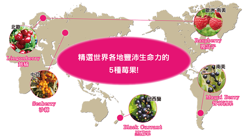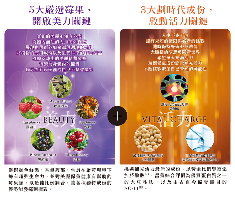 為滿足美麗與活力嚴選配方,精選「5種莓果萃取成份,開啟美力關鍵」,搭配「3大劃時代成份,啟動活力關鍵」,讓身體由內而外持續展現光輝燦爛。