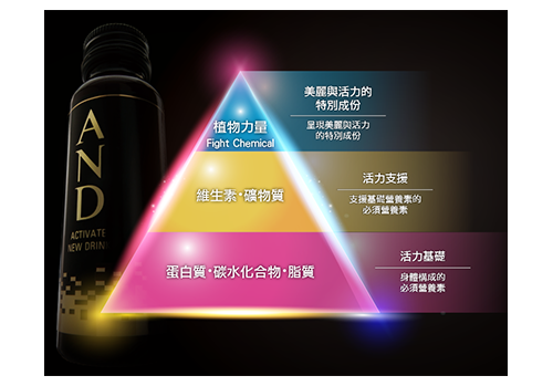 而構成人體最基本必須的營養素包括:蛋白質、碳水化合物、脂質,這是維持活力的基礎來源。中層所需的支援基礎營養的必須營養素則包括:維生素、礦物質,補充的主因是為了讓健康所需的活力支援發揮出最佳的運作。最上層是美麗與活力的極緻展現,其關鍵營養素成份來源來自於植物力量。