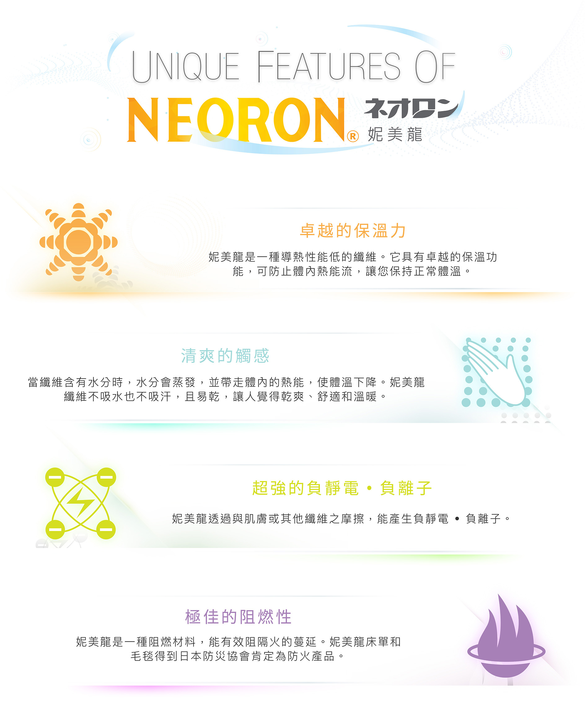 擁有100%日本研發製造、全球唯一的「妮美龍 Neoron」纖維,輕盈保溫、舒適健康,用來製成全方位衣物及寢具,溫柔守護您的健康生活。