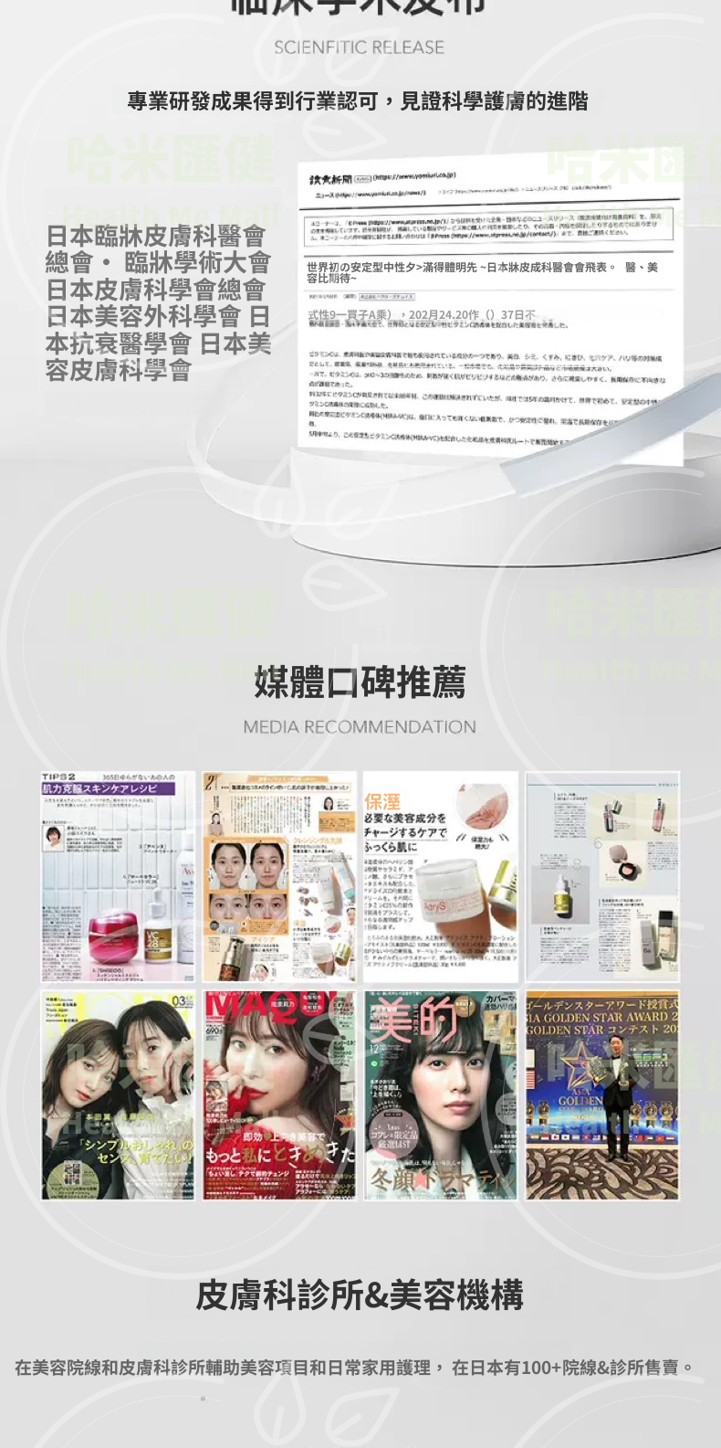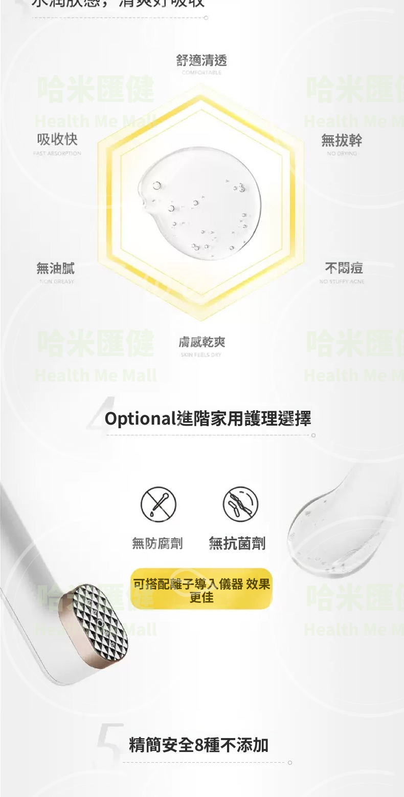 適合所有年齡、性別和皮膚類型使用,本產品不含8種添加劑,包括乙醇、礦物油、鈦、著色劑、苯甲酸酯、香料、硅酮和螯合劑。