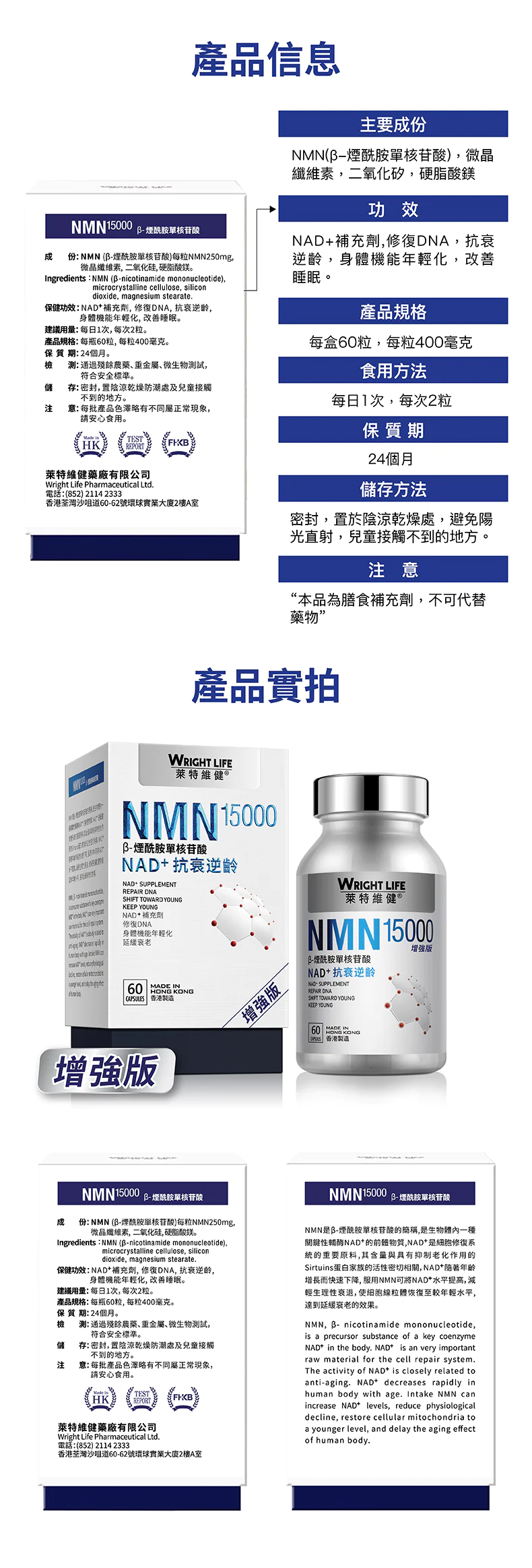 主要成份:NMN(β–煙醯胺單核苷酸),微晶纖維素,二氧化硅,硬脂酸鎂(每粒含 NMN = 250 毫克)