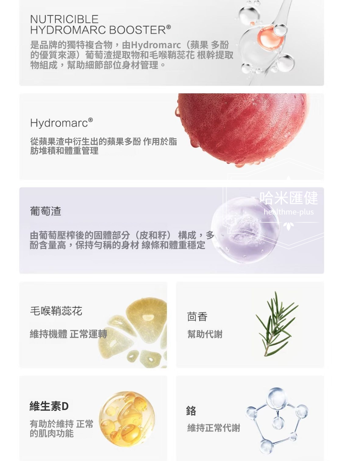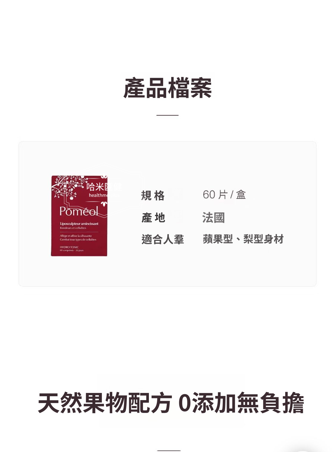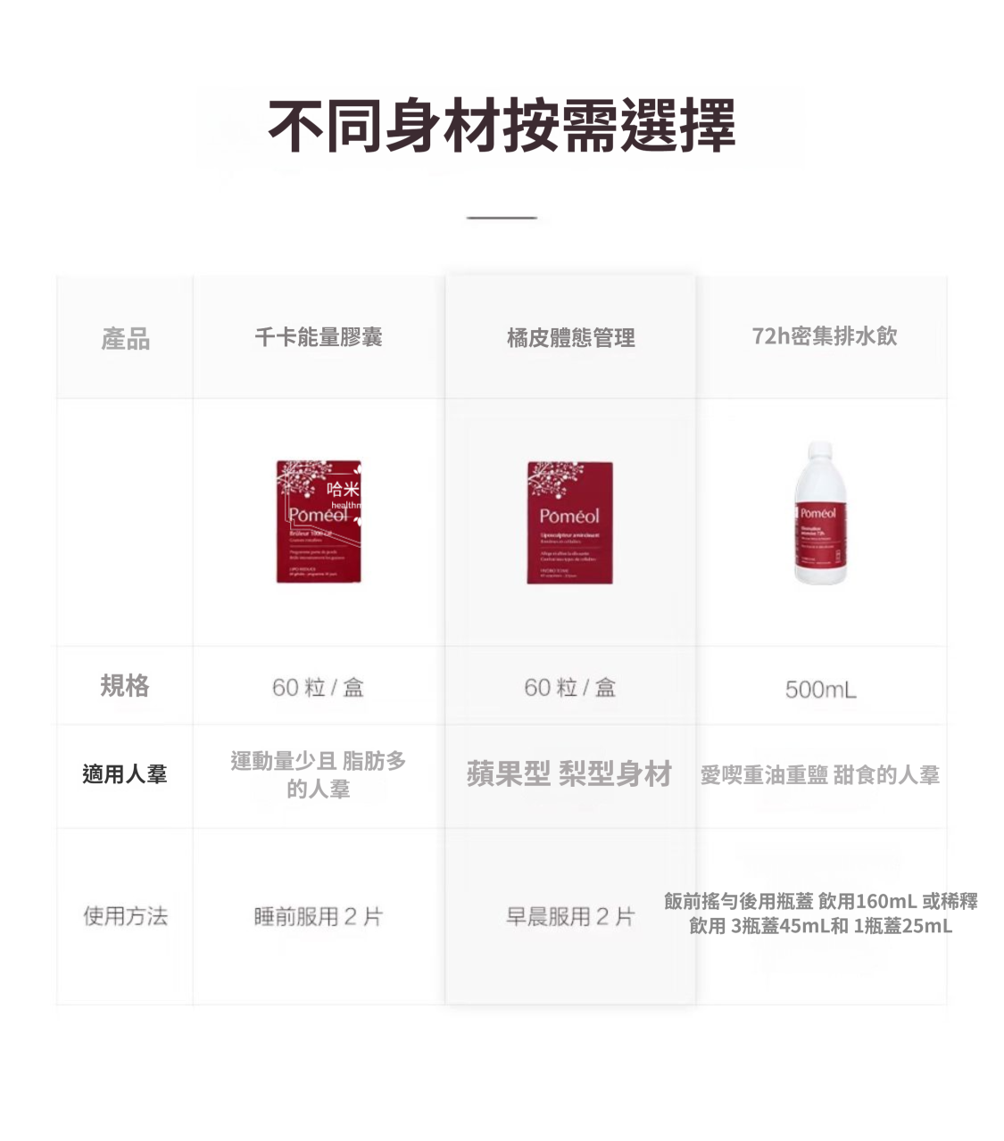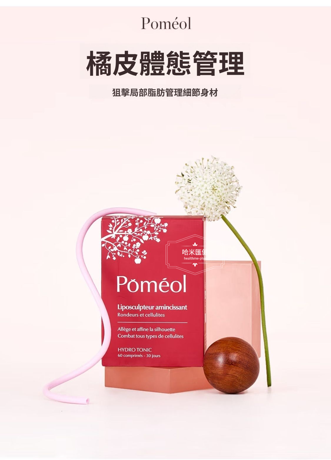 Poméol 橘皮體態管理膠囊專注於改善局部脂肪堆積及橘皮組織外觀,尤其針對臀部、大腿、腹部等重點區域。