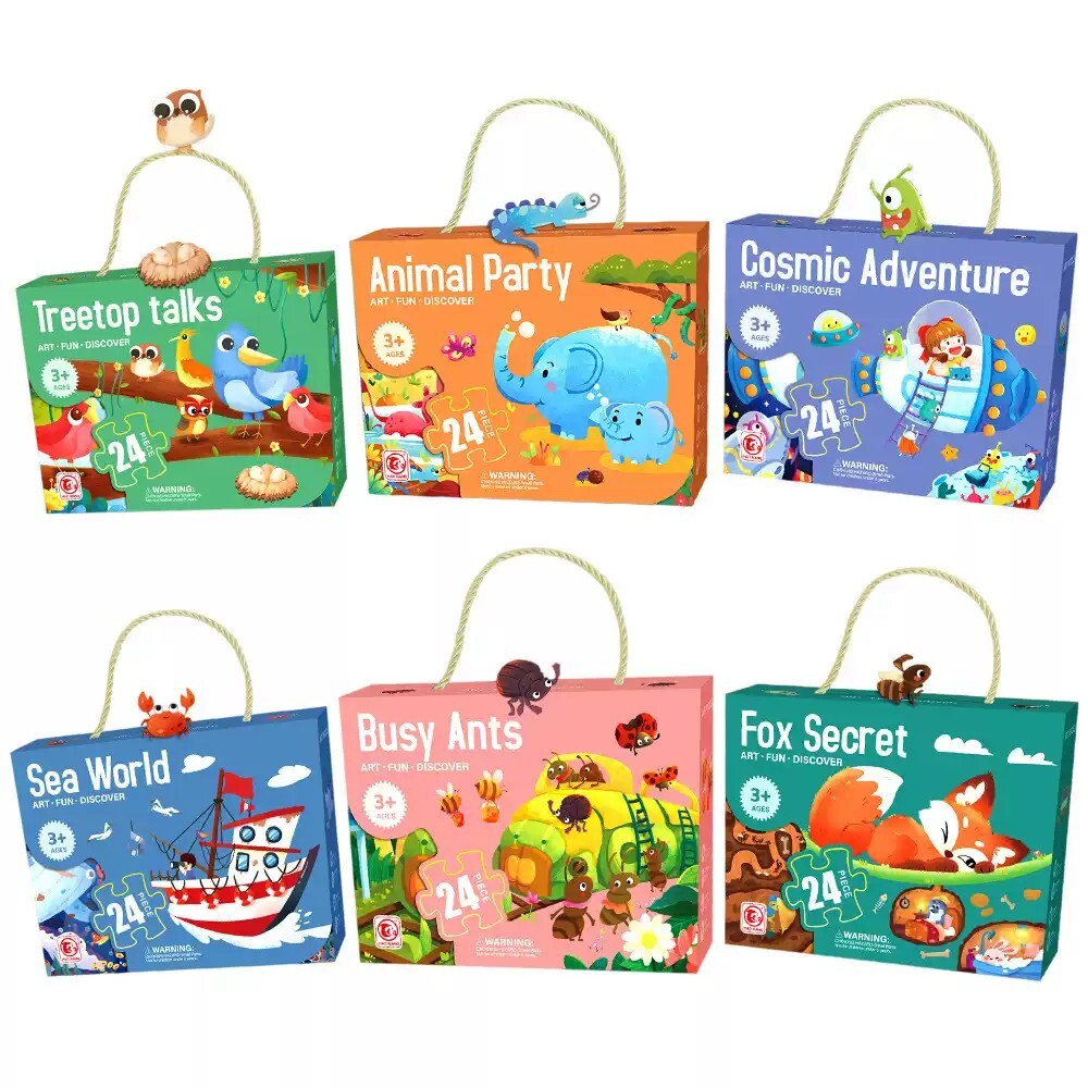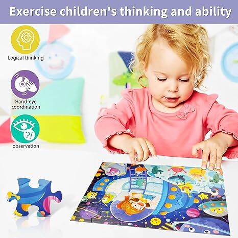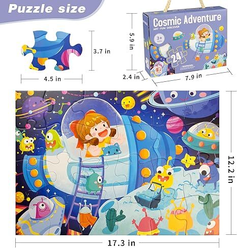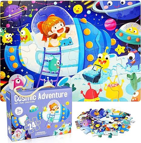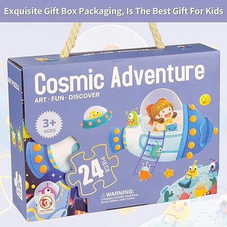 趣味兒童拼圖-這款兒童拼圖包含24片,色彩鮮豔,圖案生動有趣,描繪了一幅充滿奇幻色彩的宇宙冒險場景。