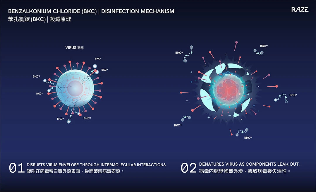 Raze消毒抗菌噴霧使用苯扎氯銨進行即時、安全而有力的消毒。