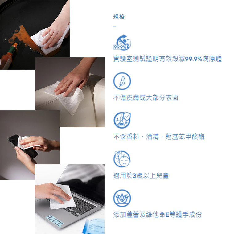 Raze 消毒濕紙巾使用苯扎氯銨進行即時、安全而有力的消毒。