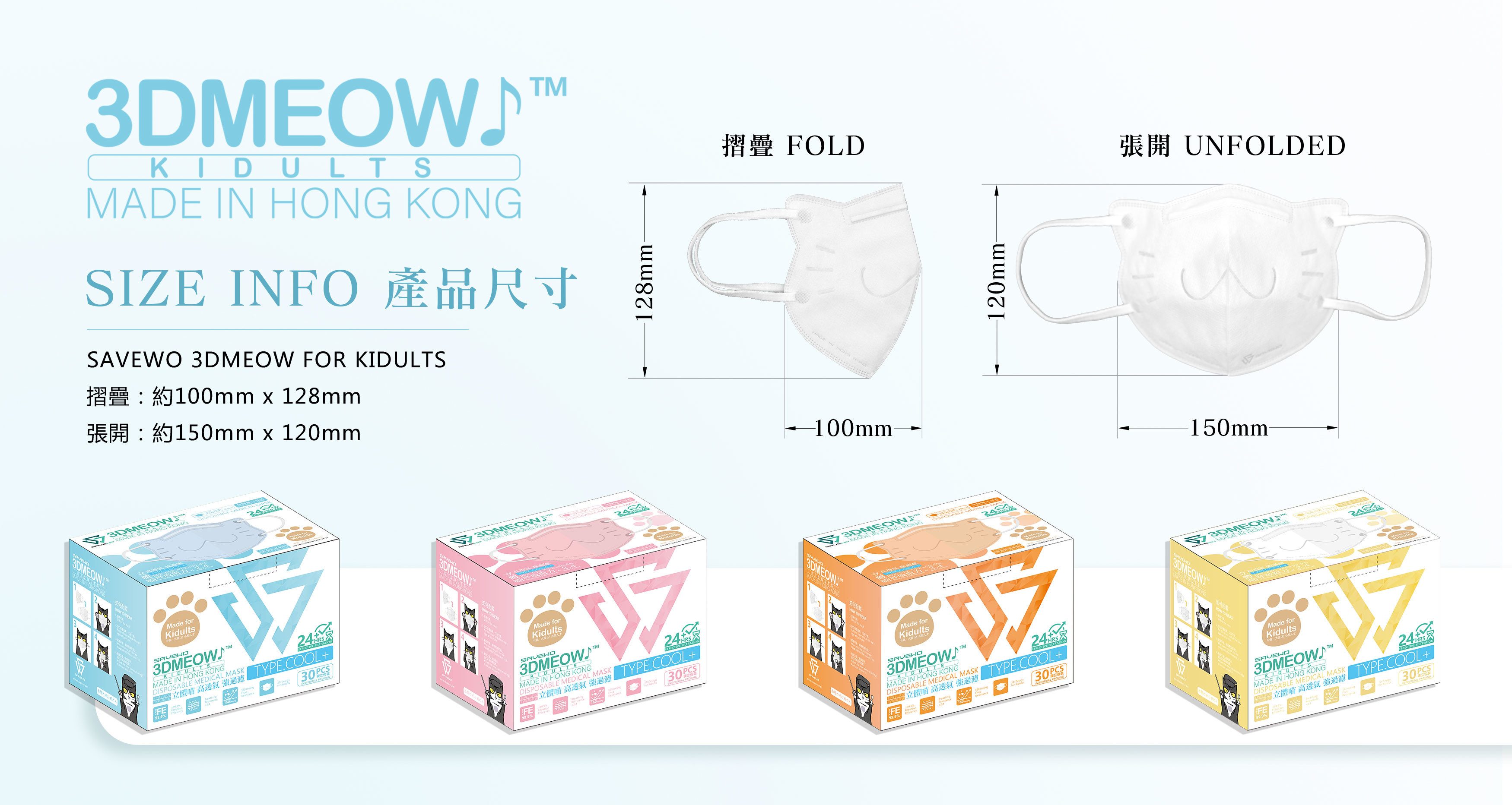 救世立體喵頑童版防護口罩採用中童及小顏成人設計,適合7歲上的中童,同時也適合各位童心未泯嘅大細路!除了白喵、粉紅喵、粉藍喵之外,仲有隻跑得慢半拍既橘貓趕黎登場!