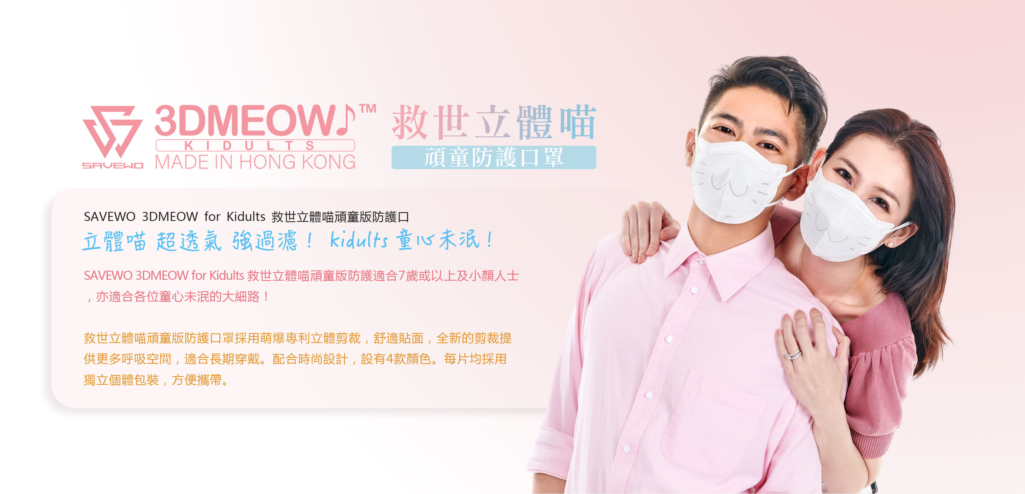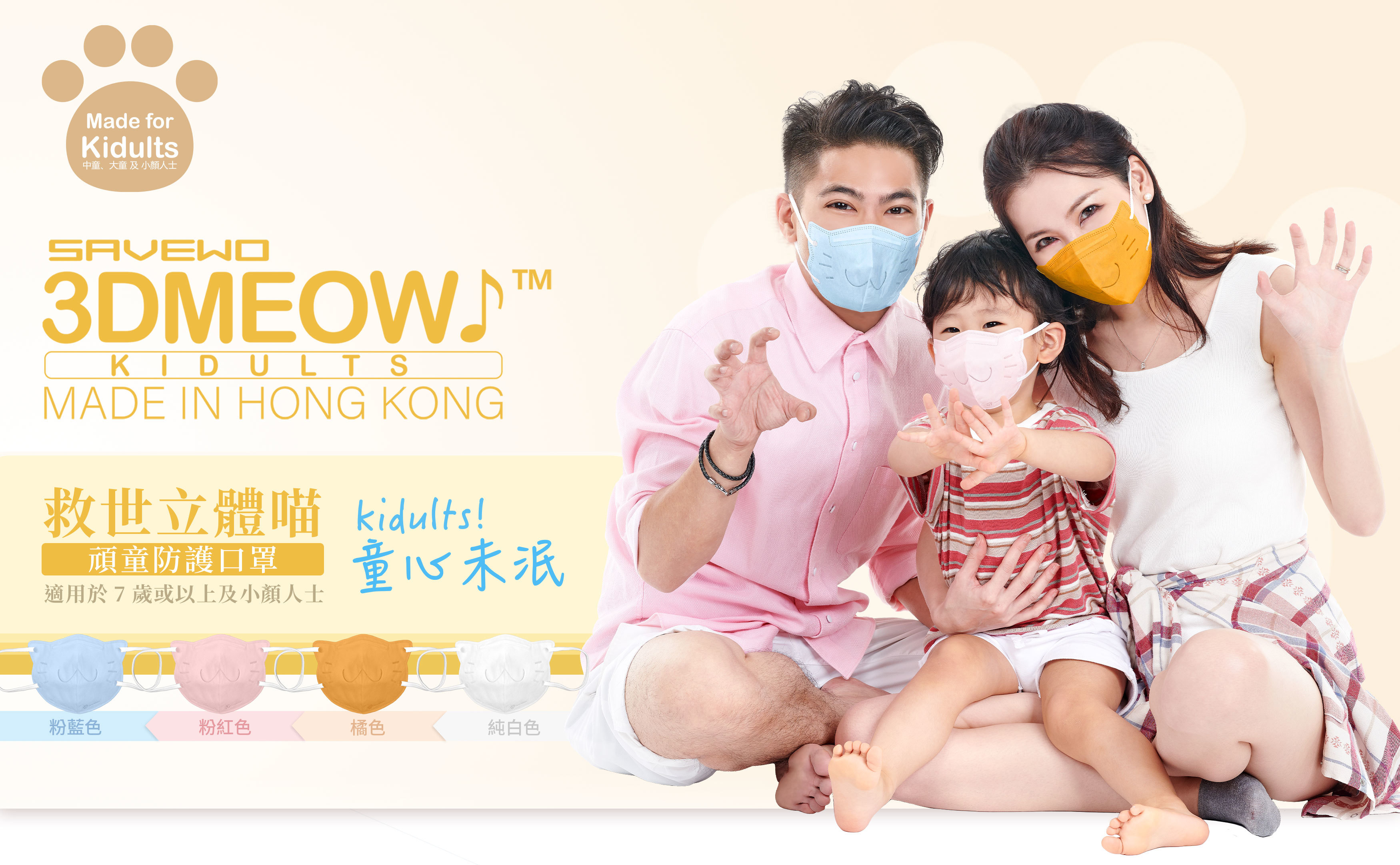 童真不是小朋友的專利,救世精心開發出全新SAVEWO 3DMEOW For Kidults 立體喵頑童版防護口罩!