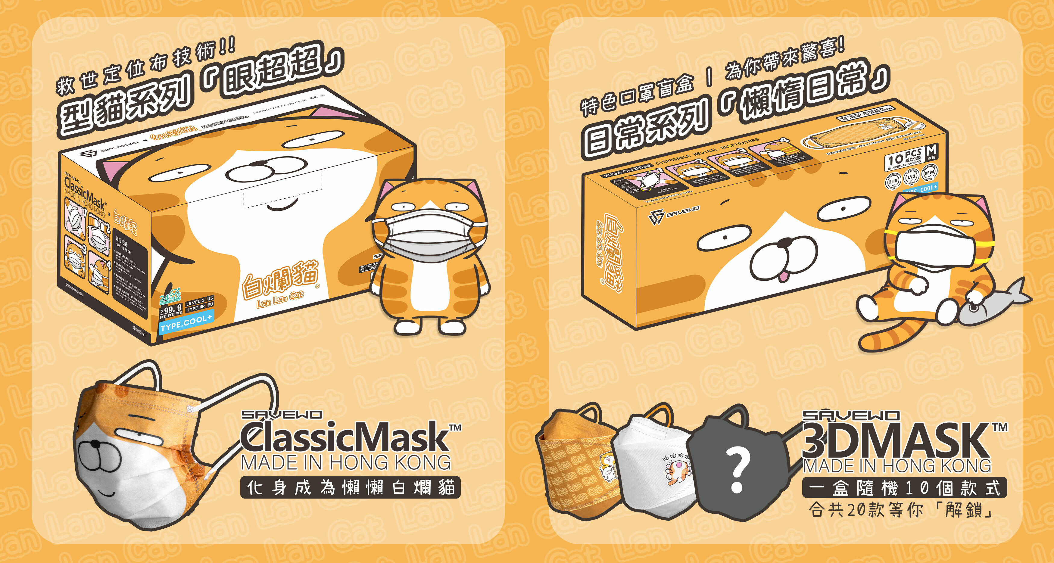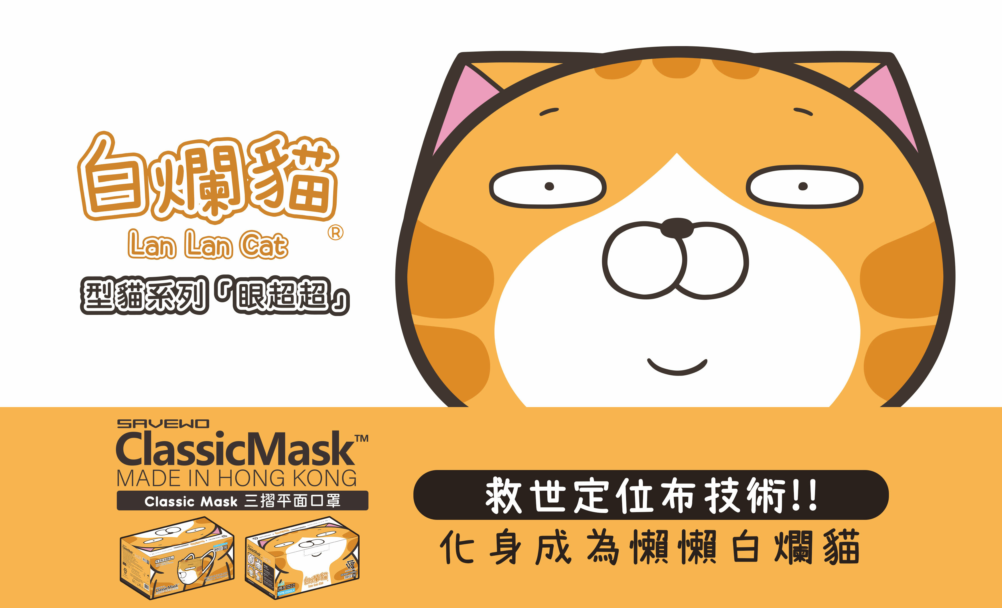 SAVEWO CLASSICMASK x 白爛貓型貓系列「眼超超」, 拉開口罩風琴位即可見調皮搗蛋嘅主子模樣,確認過眼神,將會令你忍不住即刻戴上,秒變人見人愛嘅貓樣!繼