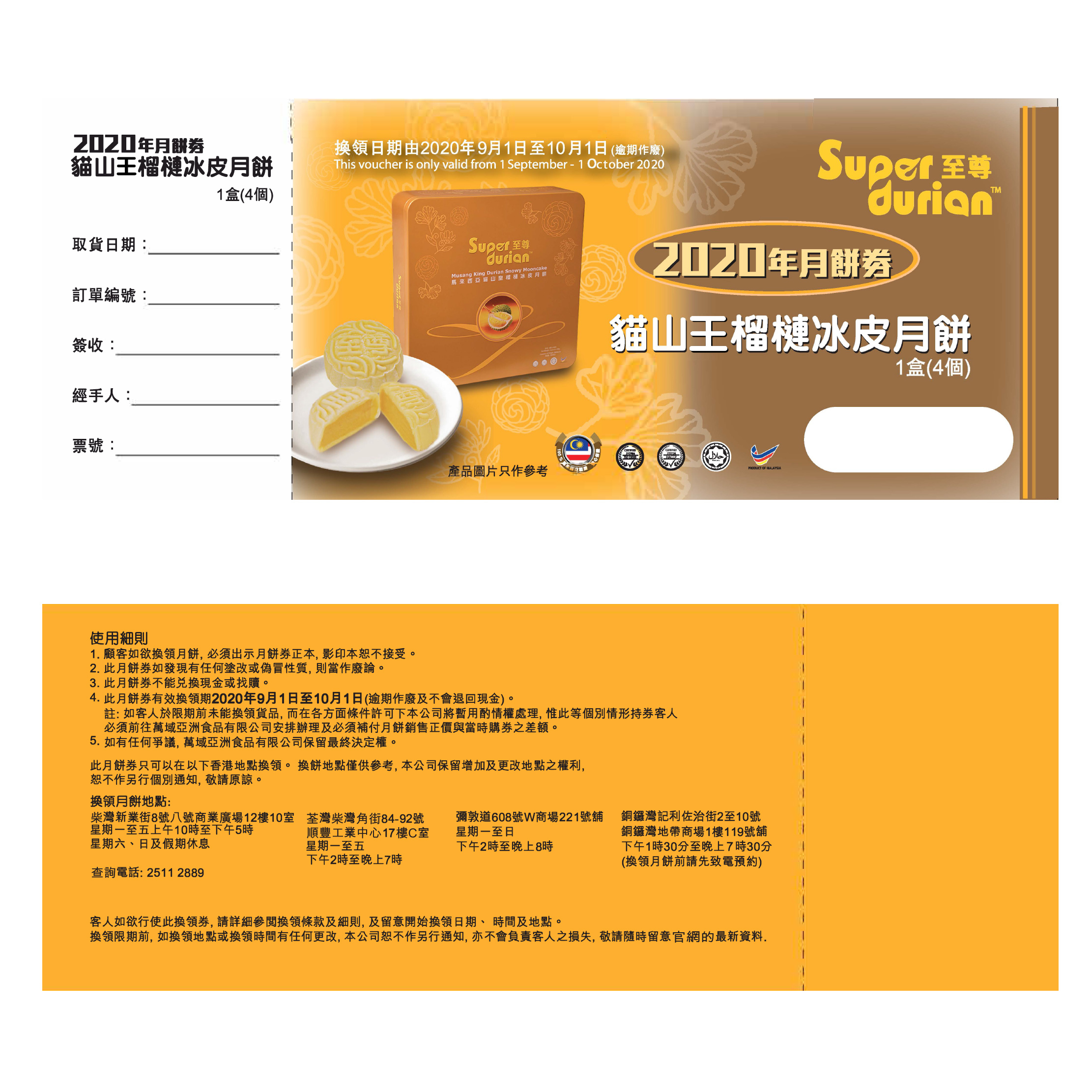 【已過期2020年9月活動】*正品*【至尊馬來西亞貓山王榴槤冰皮月餅*換領劵】Super Durian ✔馬來西亞製造*原裝進口* ✔啖啖貓山王果肉 ✔新鮮到港 (四個換取月餅點 1.旺角 2.銅鑼灣 3.荃灣 4.柴灣 *早烏優惠劵* 註:只適合於香港本地