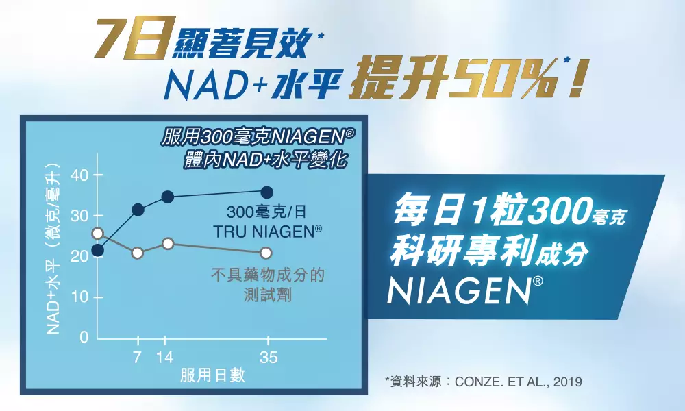 創新專利成分,全球唯一科學驗證,有效提升NAD+諾加因子水平,啟動細胞活力引擎,回復年輕活力。