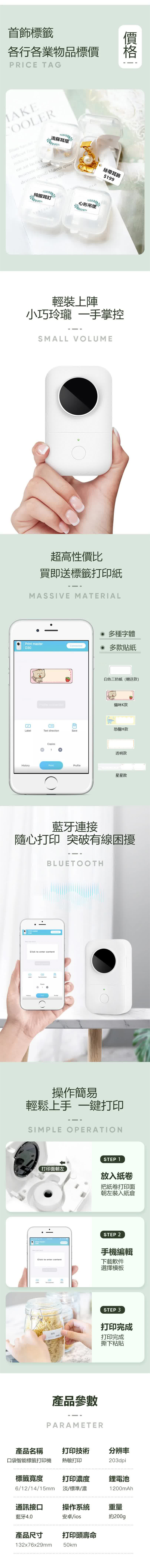 配件內容:打印機、標配耗材2卷(12*40mm白色標籤)、USB充電線、說明書