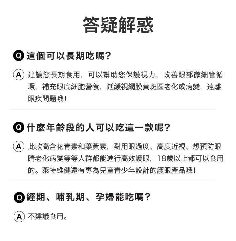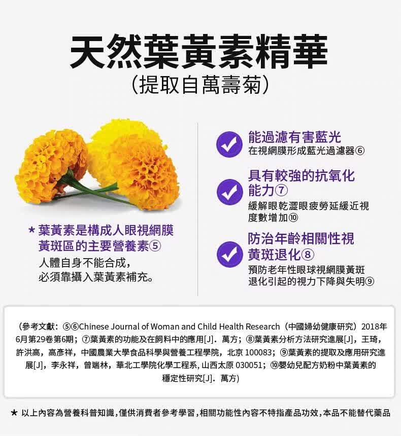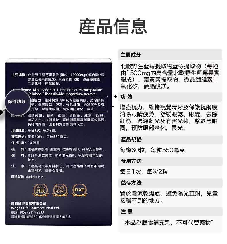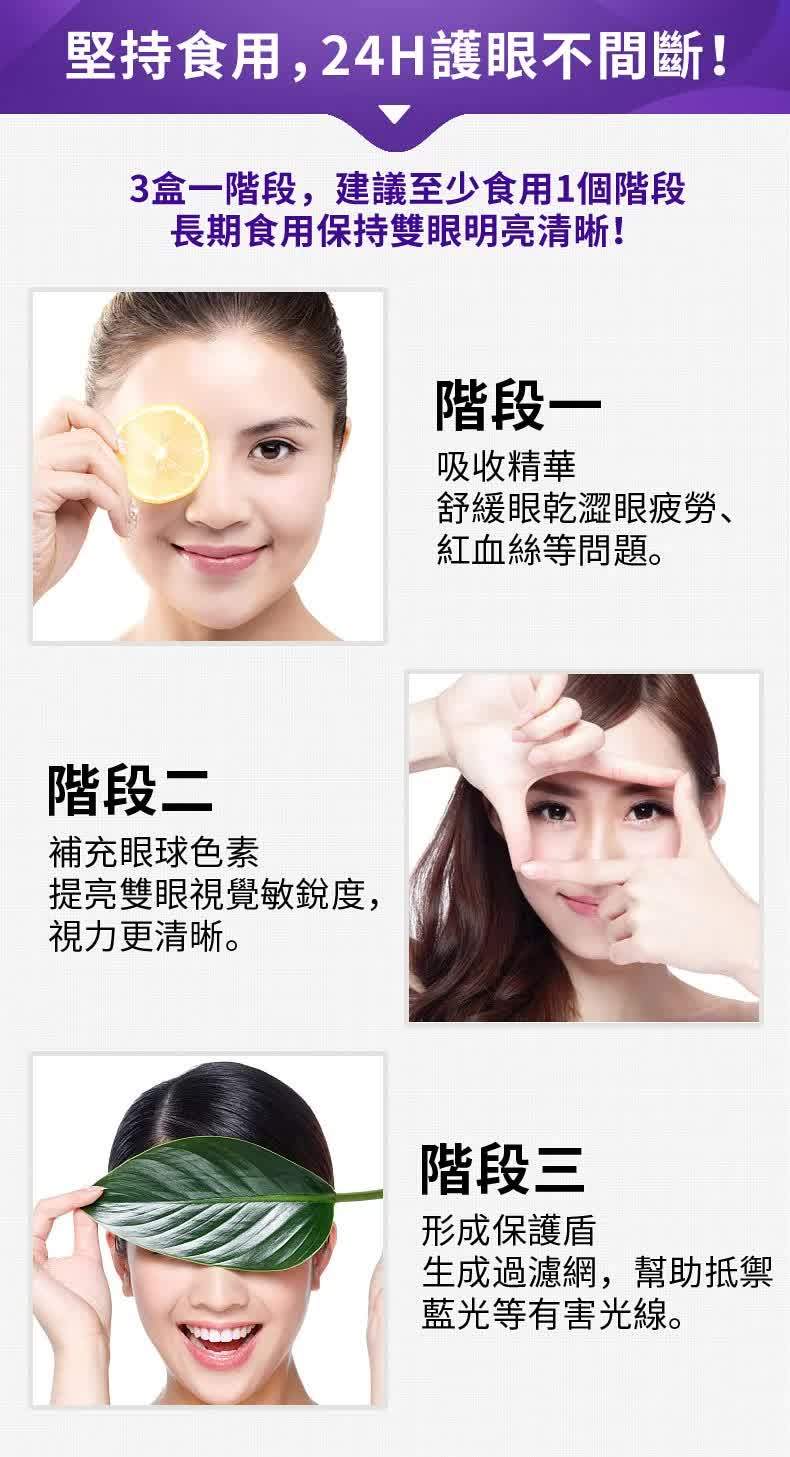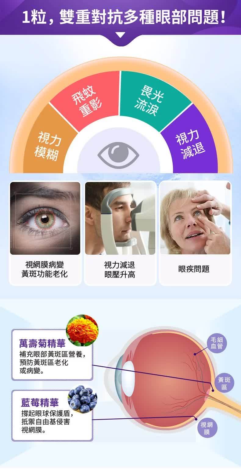 增強視力,維持視覺清晰 及 保護視網膜,消除眼睛疲勞,舒緩眼乾、眼澀,去除紅筋,過濾藍光 及 有害光線,擊退黑眼圈,高效預防老化,畏光