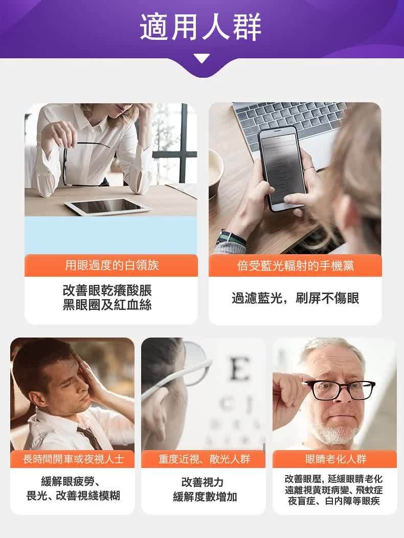 眼睛疲倦,眼乾,眼澀,黑眼圈,紅筋,近視,老花人士,夜間駕駛,長時間觀看電腦屏幕或電視,長時間閱讀,出現視覺影像模糊人士