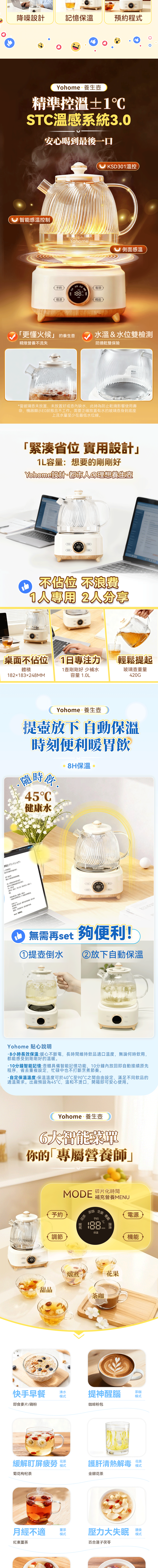 6. 10分鐘提壺記憶: 倒水放下後自動延續原程序,無需重新設置,煮茶不間斷。
