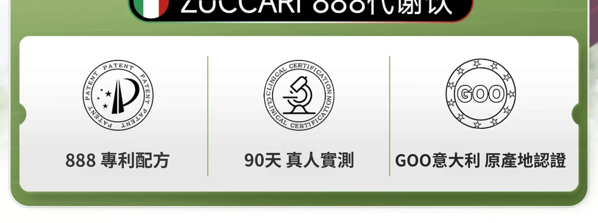 ZUCCARI 888還是有7、8種國際證書的,90天GOO義大利原產地認證、SGS國際品質管理體系認證、GMP藥品生產管理認證等,還有90天真人臨床驗證,買的就是放心!