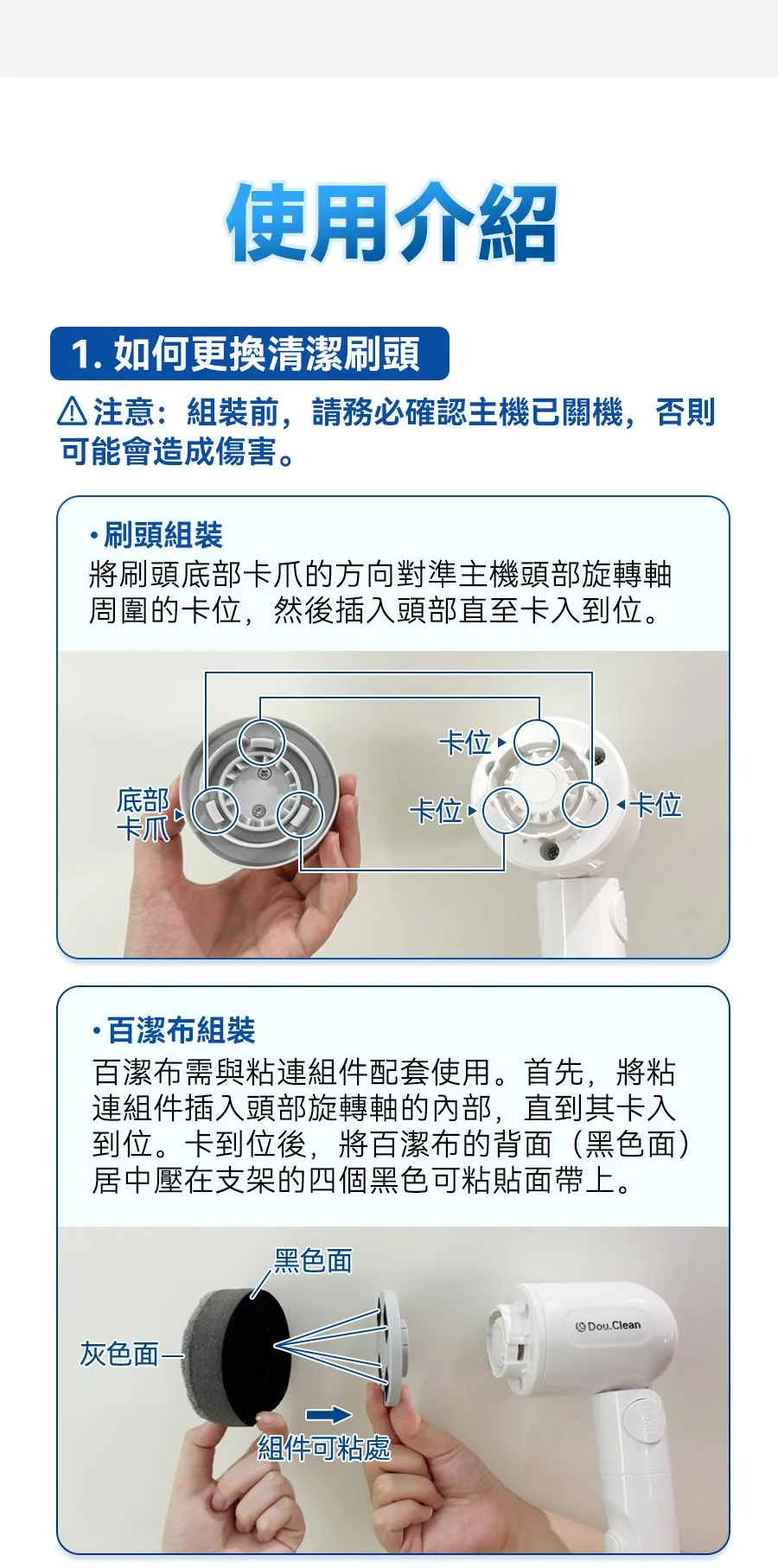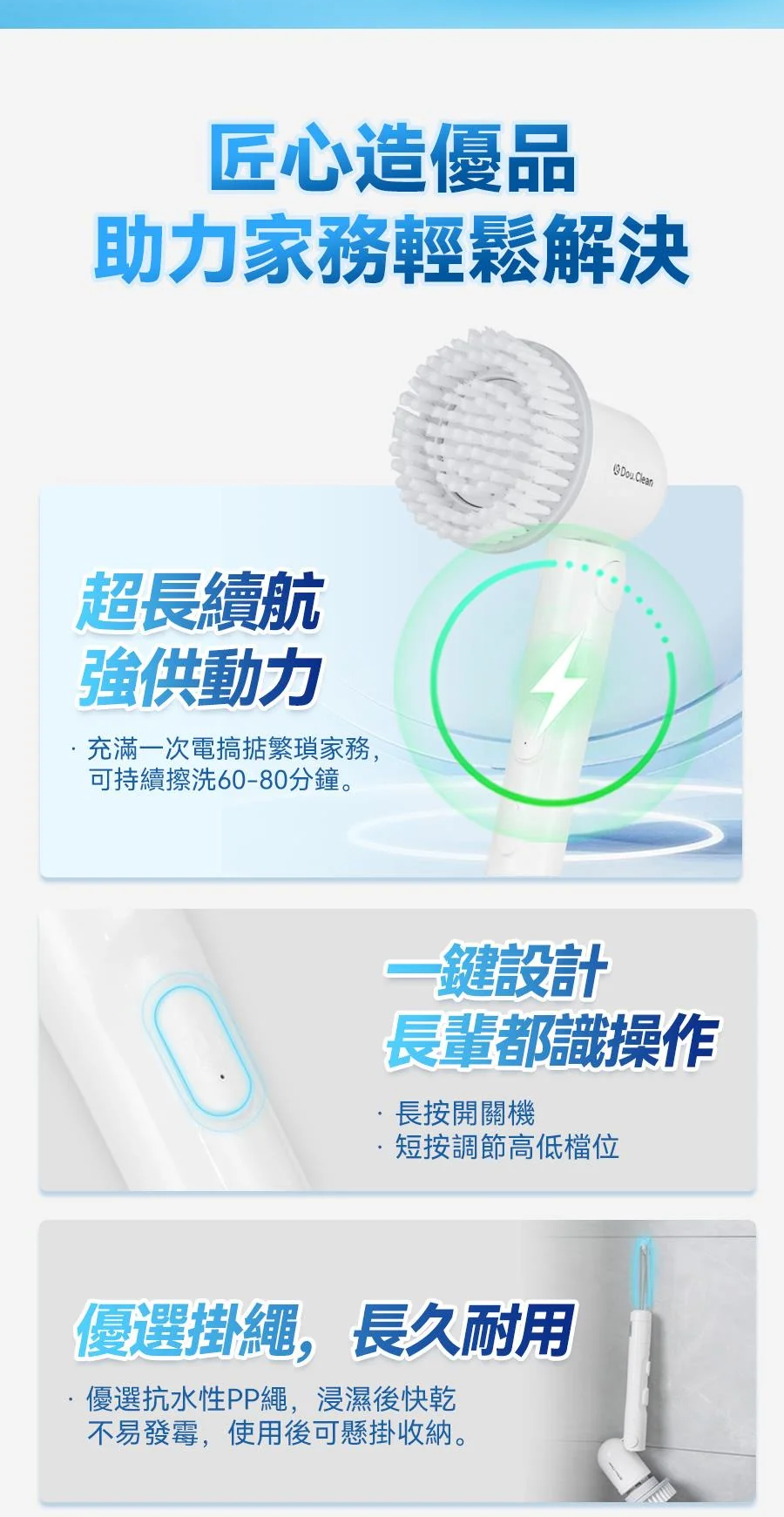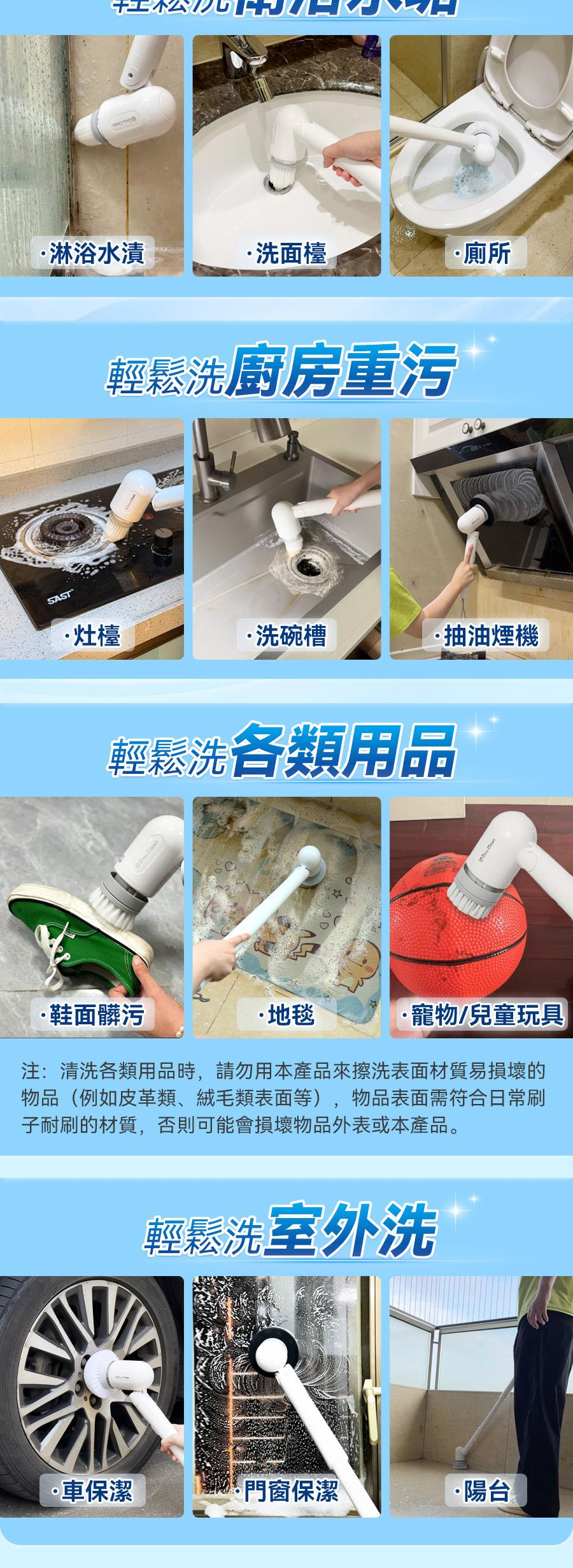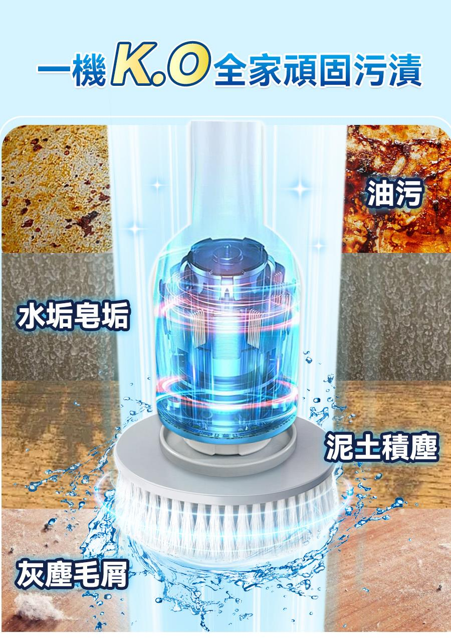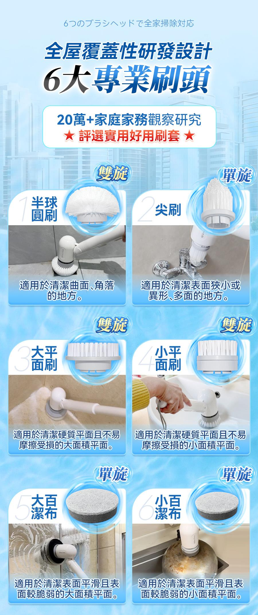 1.大扭力高轉速電機搭配6種清潔頭,適用不同材質表面的髒汙清潔。