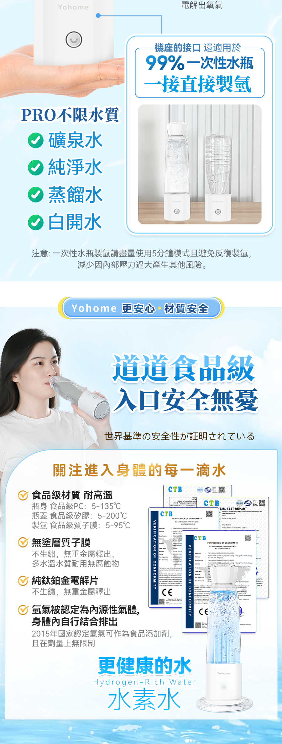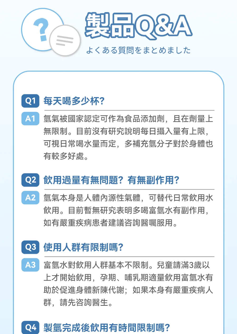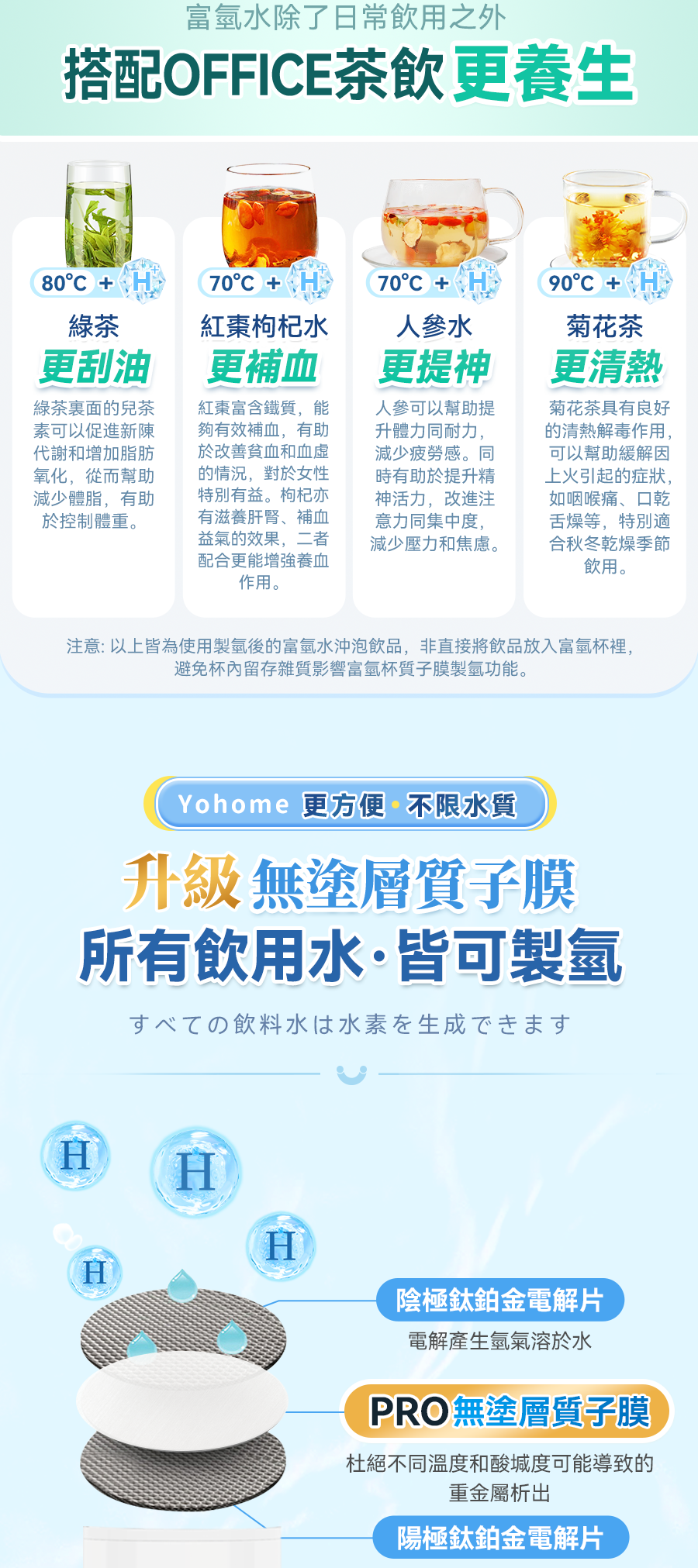2.升級製氫技術,SPE膜電極氫氧分離+純氫電解技術+保壓洩壓功能,產生小分子團水的同時排除餘氯臭氧及重金屬等有害物質,不限制水質,熱水也可用,飲用更加便利健康放心